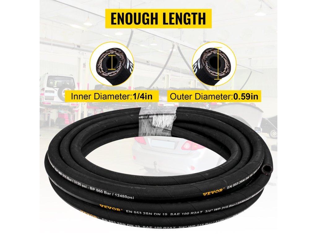 Az ömlesztett hidraulikatömlő 328 láb hosszú, 1/4 hüvelyk belső átmérőjű és 0,59 hüvelyk külső átmérőjű.