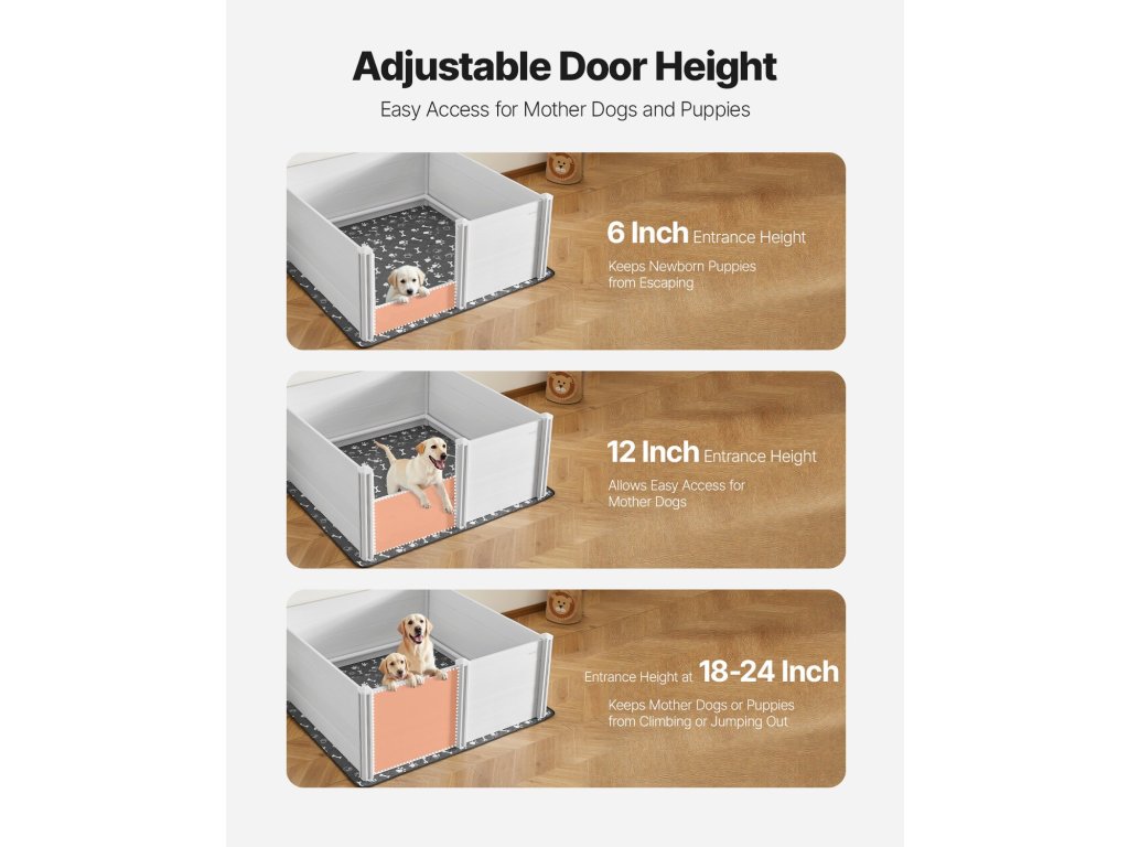 A beépített vezetősínek segítenek megakadályozni, hogy a kölykök összezúzódjanak, míg az alapon lévő 3M csúszásmentes matricák stabilan tartják a falakat, anélkül, hogy aggódni kellene a dőlés miatt. A bővíthető kialakítás lehetővé teszi, hogy a tér együtt nőjön a kutyával.
