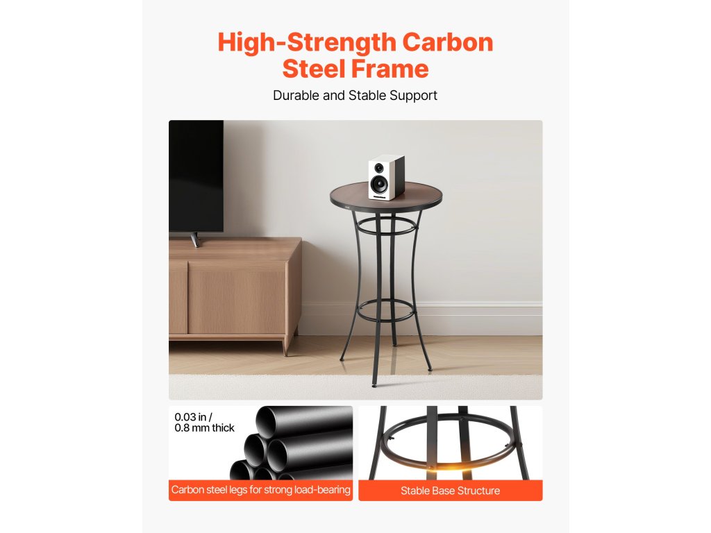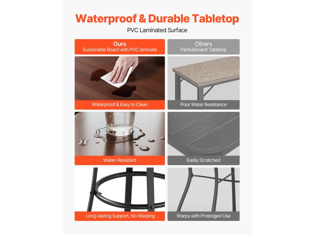 Az asztallapot úgy tervezték, hogy kiválóan ellenálljon a hajlításnak és a vetemedésnek. A pultmagasságú bisztróasztal biztonságosan tarthat dekantereket, gyümölcstálcákat vagy jégvödröket anélkül, hogy meginogna.