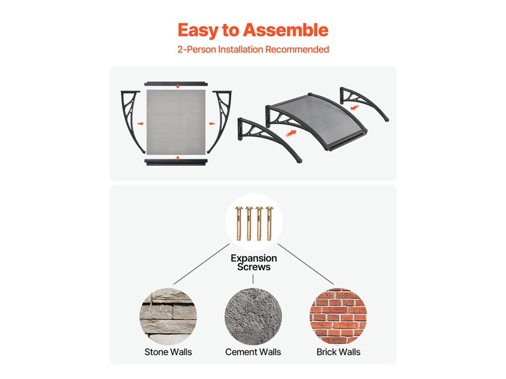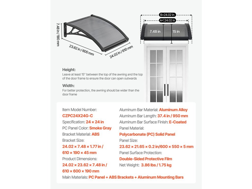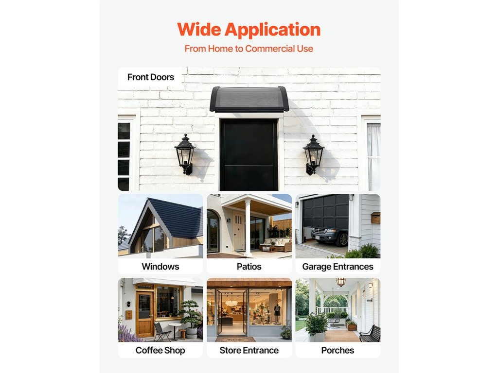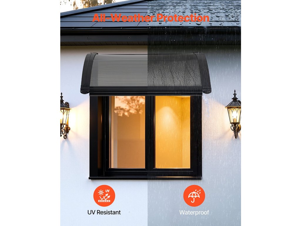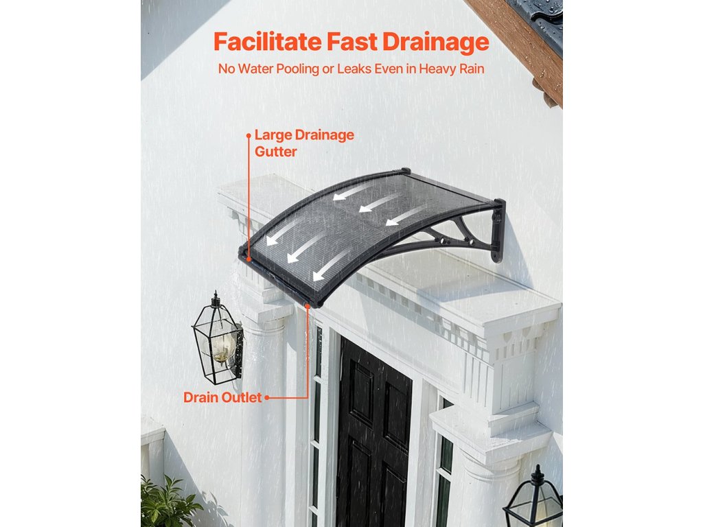 A polikarbonát ablak-ajtó napellenző megnövelt és továbbfejlesztett vízelvezető ereszcsatornával rendelkezik, amely hatékonyan vezeti el az esővizet a bejárattól. Segít megelőzni a csúszós felületeket, miközben megbízható, egész évszakos időjárásvédelmi megoldást nyújt tiszta, modern megjelenéssel.