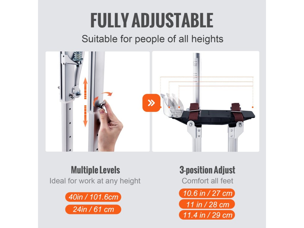 Výšku chodúľ môžete jednoducho nastaviť od 24 do 40 palcov, čím splníte rôzne pracovné potreby. Vďaka 3-polohovému držiaku päty sa hodia pre väčšinu veľkostí chodidiel. Či už pracujete na sadrokartóne, maľujete alebo vykonávate elektrické práce, tieto chôdze sa prispôsobia vašim požiadavkám. Vďaka nastaviteľnej výške sú univerzálne na rôzne projekty. Tieto skrutky umožňujú rýchlu a jednoduchú zmenu výšky, takže môžete pohodlne pracovať v akejkoľvek výške. Získajte ideálnu výšku pre svoju úlohu s minimálnym úsilím.