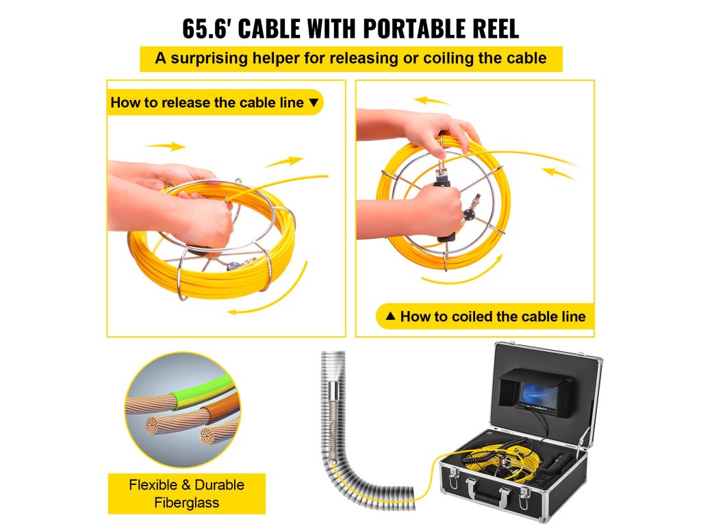Ez a csatornakamera-csomagot egy robusztus 65,6m/20m-es kábellel szállítjuk. Kiváló minőségű kábelünk lehetővé teszi, hogy a kameraegység szűk földalatti környezetben is működjön, és támogatja a tiszta képeket és videót.
