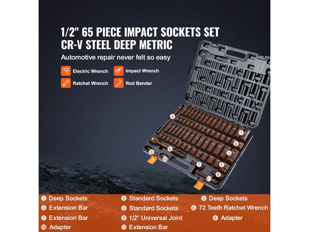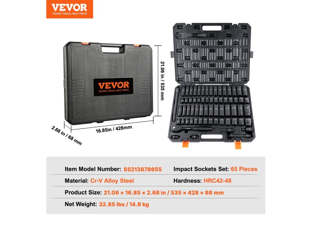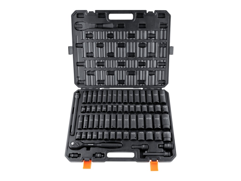 Professzionális és hordozható ütvecsavaros dugókulcs-készletet keres? a 65 darabos VEVOR ütvecsavaros dugókulcs-készlet teljes körű szerszámkészletet kínál, amely különösen alkalmas a különböző márkájú autók javításához.