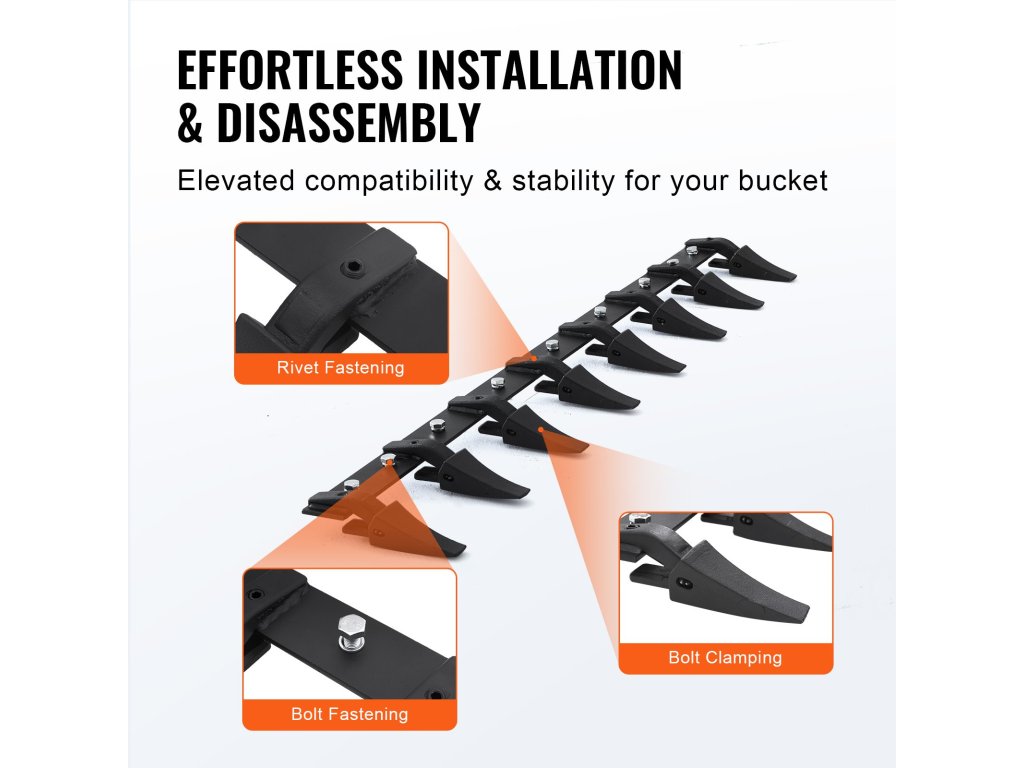 A vödörfogas rudat úgy terveztük, hogy szegecseléssel történő rögzítéssel gond nélkül beállítható legyen, és csavarokkal van tovább erősítve. A legtöbb rakodógép-típussal kompatibilis, és a rögzítőcsavarokkal ellátott innovatív kialakítás biztosítja a biztonságos, ütésmentes csatlakozást a rakodógéphez.