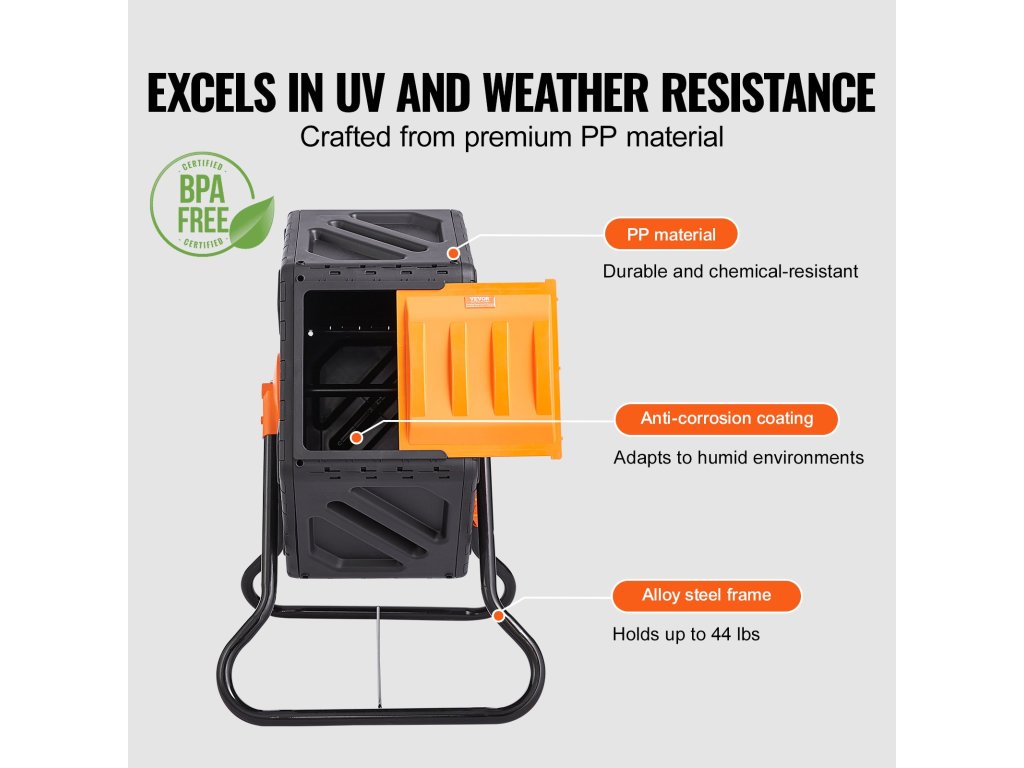 A komposztáló mély belső barázdái biztosítják az anyagok alapos keveredését, míg a stratégiailag elhelyezett szellőzőnyílások biztosítják a szerves anyagok gyors lebomlásához szükséges oxigént. Mondjon búcsút a kellemetlen szagoknak a komposztálás során.