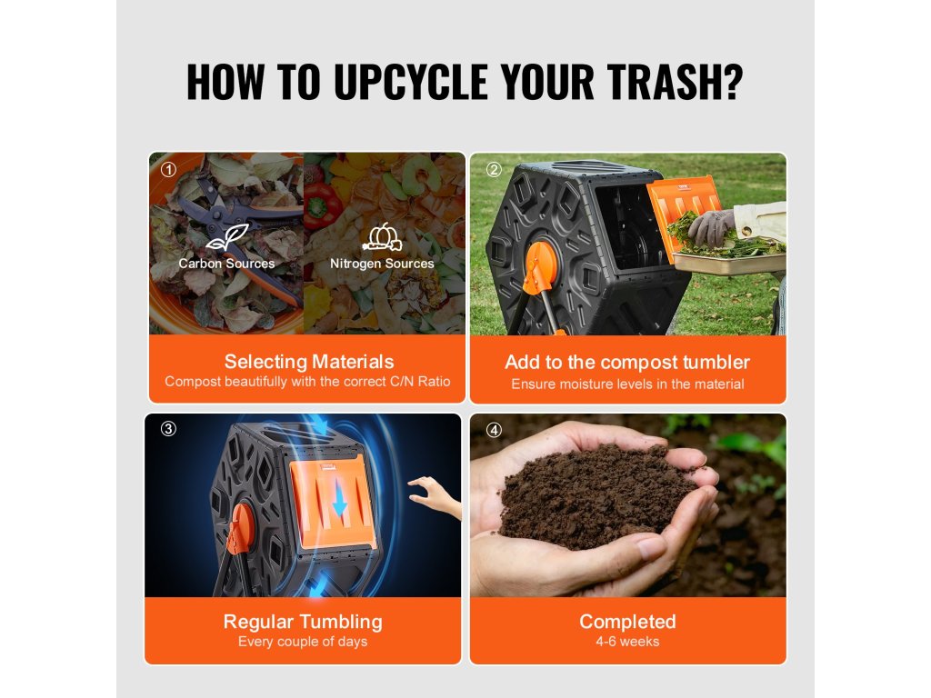 A kerti komposztgyűjtő 360°-ban megfordítható kialakítású; nincs szükség kézi keverésre. A rendszeres forgatással optimális komposztálási eredményt ér el, és példátlan kényelmet kínál a kertészkedéshez.