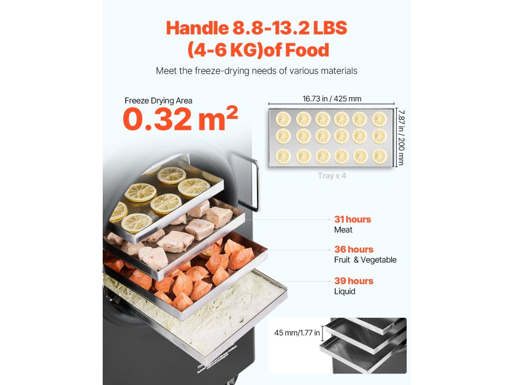 A liofilizálás alkalmas gyümölcsök, zöldségek, gabonafélék, hús, virágtea, állateledel és egyéb élelmiszerek szárítására. Ezt a liofilizáló gépet széles körben használják az élelmiszeriparban, a táplálékkiegészítőkben és a szabadtéri élelmiszerekben.