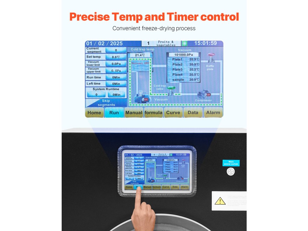 A nagy felbontású érintőképernyős kijelző kényelmes kezelést biztosít, erőteljes funkciókkal és szegmentált szárítási görbékkel, hogy megfeleljen a különböző anyagok fagyasztva szárítási igényeinek. Ügyeljen arra, hogy megfelelően földelt elektromos csatlakozót használjon ≤30°C-os üzemi környezeti hőmérsékleten.