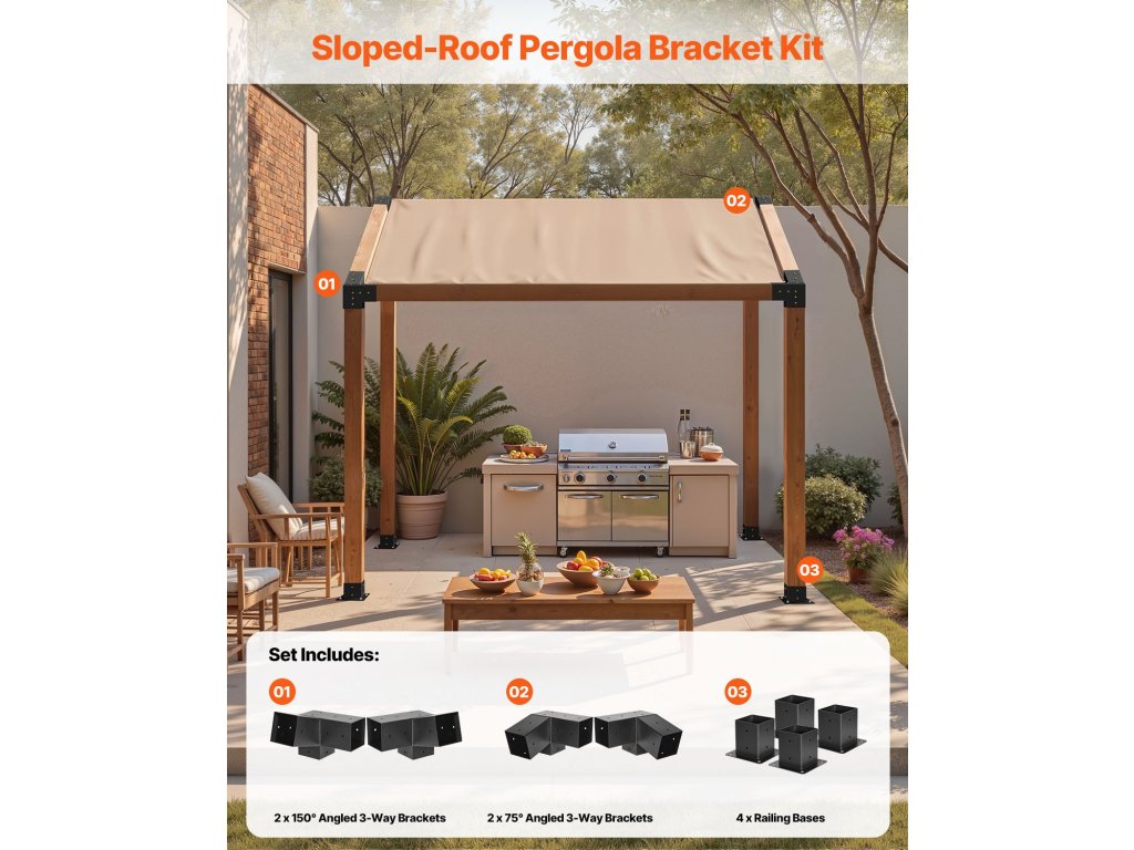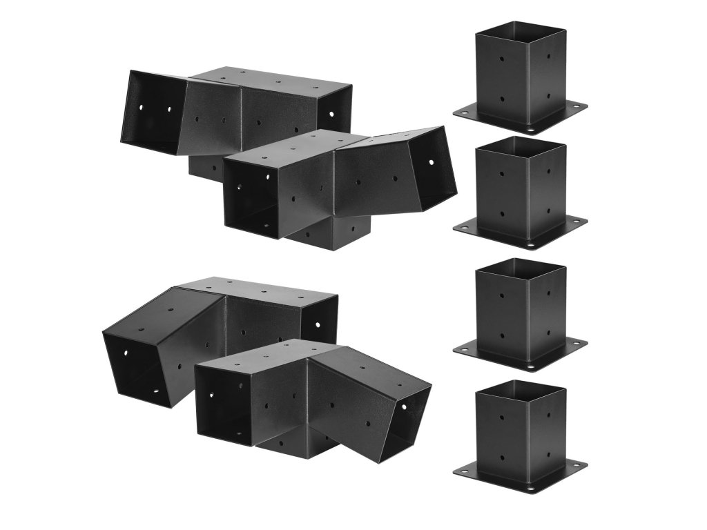 A1: Ez a készlet két 15°-os szögű háromirányú konzolt, két 75°-os szögű háromirányú konzolt és négy korlátalapot tartalmaz. Ferde tetővel rendelkező pergola építéséhez készült.