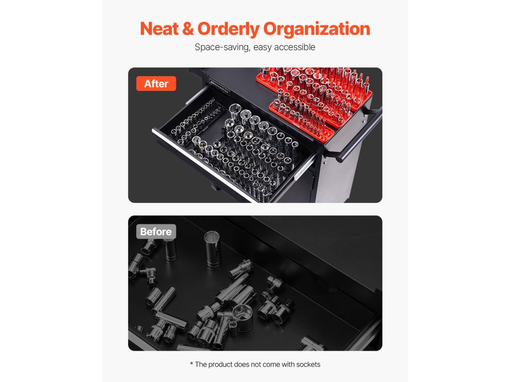 A fiókszervező mély/alacsony soroszlopos kialakítása lehetővé teszi a méret szerinti rendezést, így a szerszámok könnyebben kezelhetők és megtalálhatók, időt takarítva meg a feladatok elvégzése során.