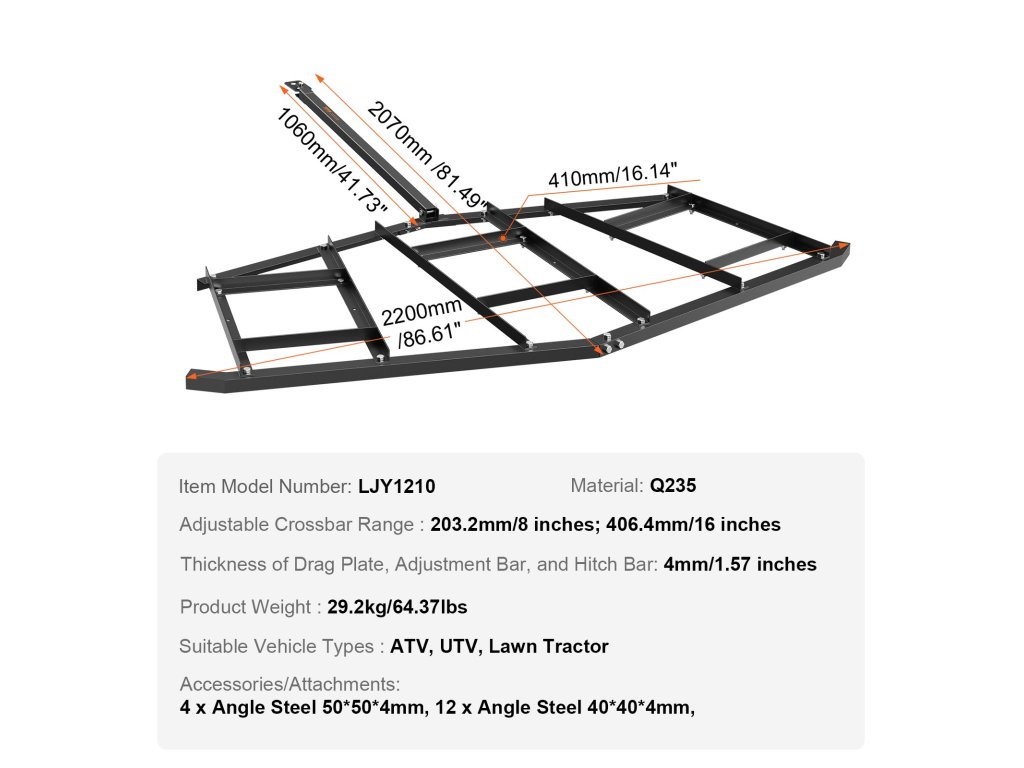 Legyen szó szántóföldek, sportpályák műveléséről, udvarok szépítéséről vagy kavicsos feljárók karbantartásáról, ez a tereprendező traktor tökéletesen alkalmas különböző járműtípusokhoz, beleértve az ATV-ket, UTV-ket, kerti traktorokat és segédtraktorokat. Ez az Ön egyablakos partnere a földművelésben.