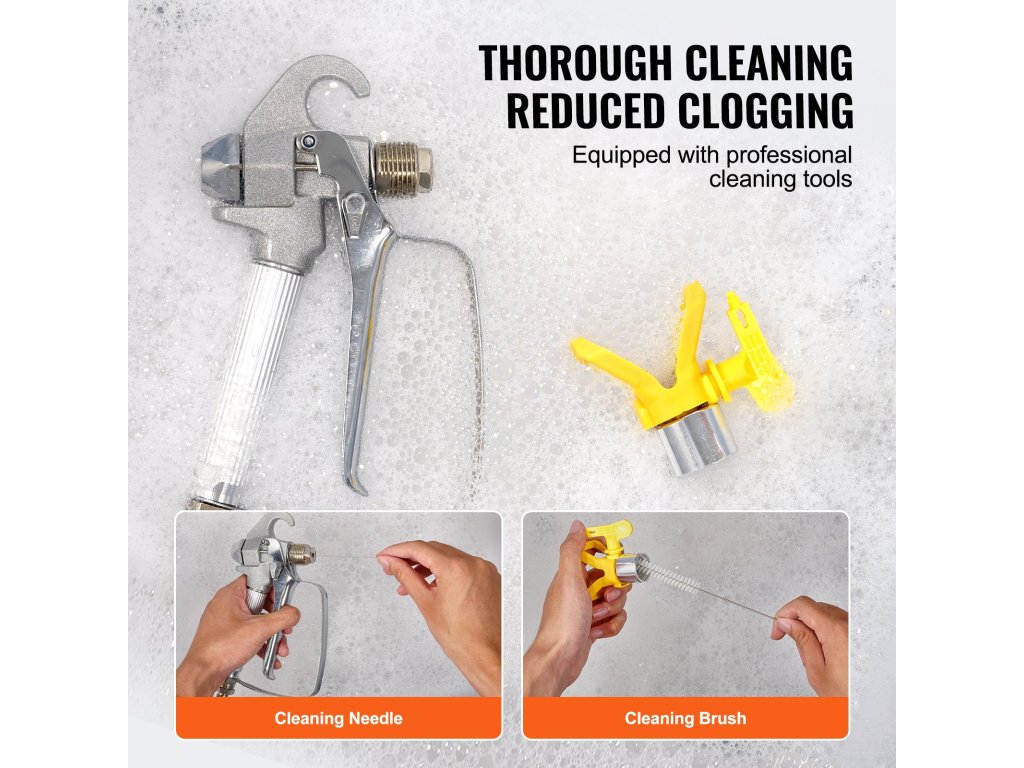 A kerekes kialakításnak köszönhetően az elektromos airless permetezőgép könnyen, emelés nélkül mozgatható a kívánt helyre. Ez a funkció különösen hasznos nagyméretű vagy gyakran változó munkakörnyezetben. A mellékelt tisztítótű és kefe tovább egyszerűsíti a karbantartást és a tisztítást.