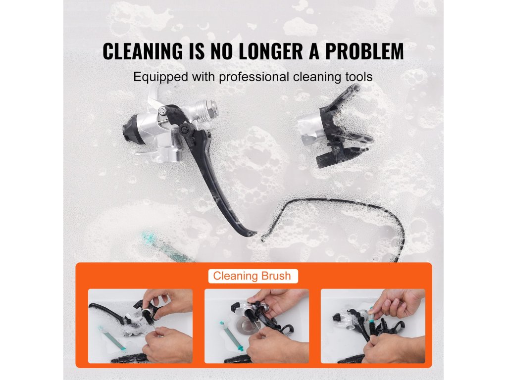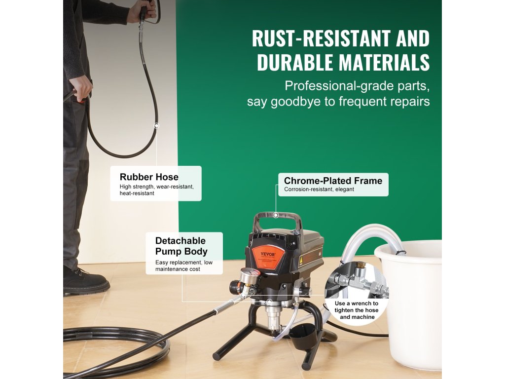 A tartósság és az esztétikum érdekében korrózióálló krómkerettel rendelkezik. Airless festékszórónk nagymértékben csökkenti az eltömődés és a szivárgás kockázatát, és környezetbarát, egyenletes festést biztosít. Meghosszabbított rúddal rendelkezik a magasan végzett munkákhoz. Nincs szükség többé erőlködésre vagy mászásra!