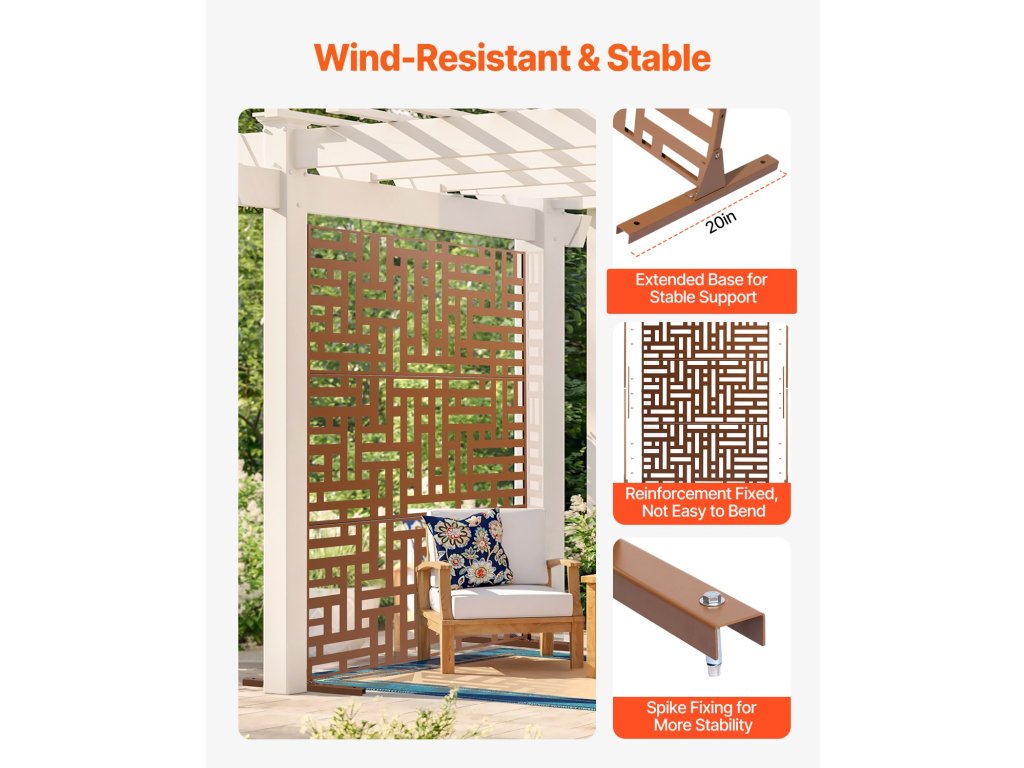 Ez a 36×72 hüvelykes fém adatvédelmi paraván korrózióálló és tartós, ideális hosszú távú kültéri használatra. Szélállósága miatt ideális kertekbe, teraszokra és udvarokra, ahol egyszerre nyújt magánéletet és stílust. Beltérben is használható a terek elválasztására, sokoldalú, elegáns elválasztást biztosítva.