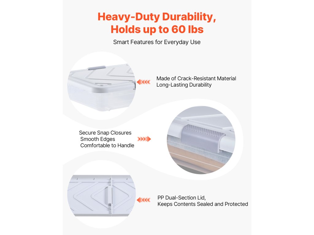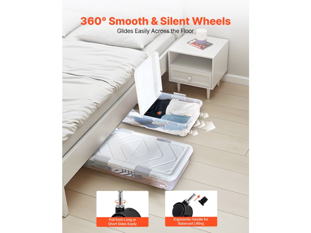 Ez a guruló ágy alatti tároló oldalsó fogantyúval és négy, 360°-ban simán forgatható (némelyik reteszelhető) görgővel rendelkezik, így könnyen siklik a különböző felületeken, és biztonságos elhelyezést tesz lehetővé.