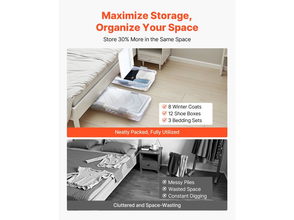 Ez az ágy alatti tároló elfér ágyak, kanapék, asztalok és bútorok alatt, és praktikus megoldást kínál a ruhák, cipők és játékok rendszerezésére.