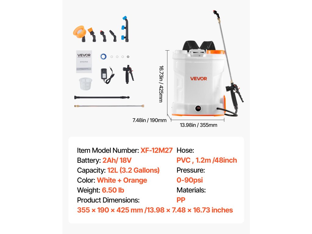 | Hlavné materiály | Nádrž z PP (polypropylénu), striekacia tyč zo sklenených vlákien, striekacia tyč z nehrdzavejúcej ocele, plastové trysky |