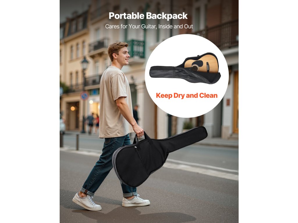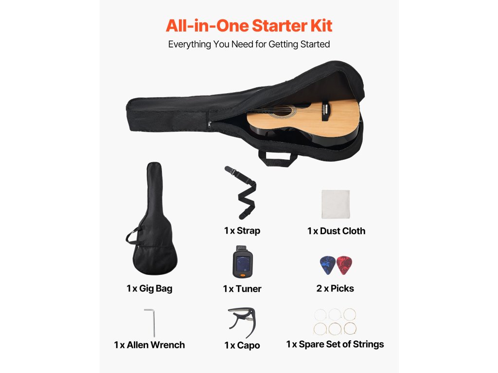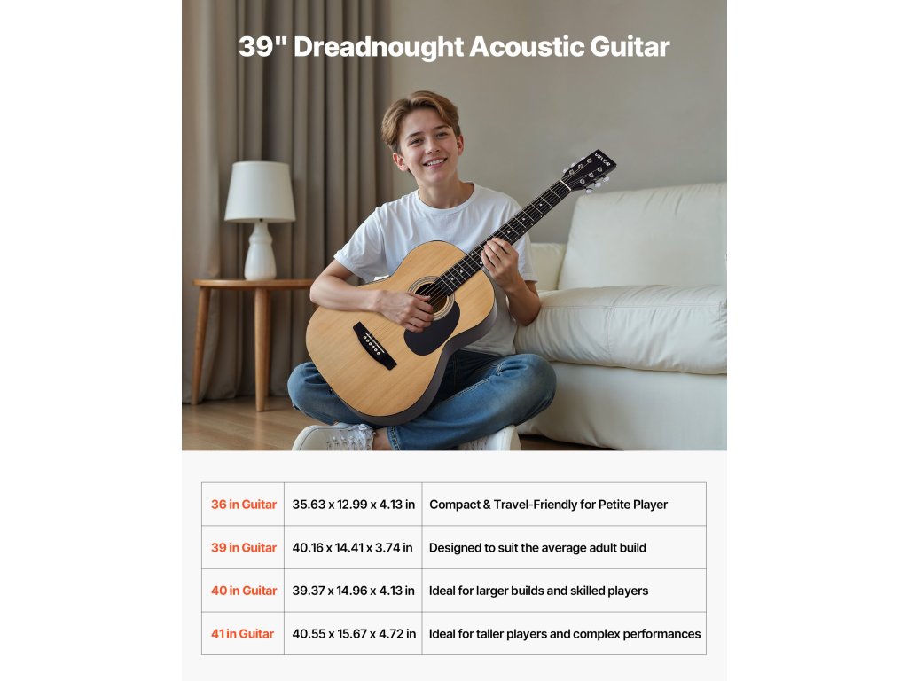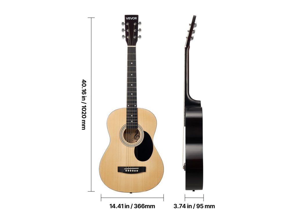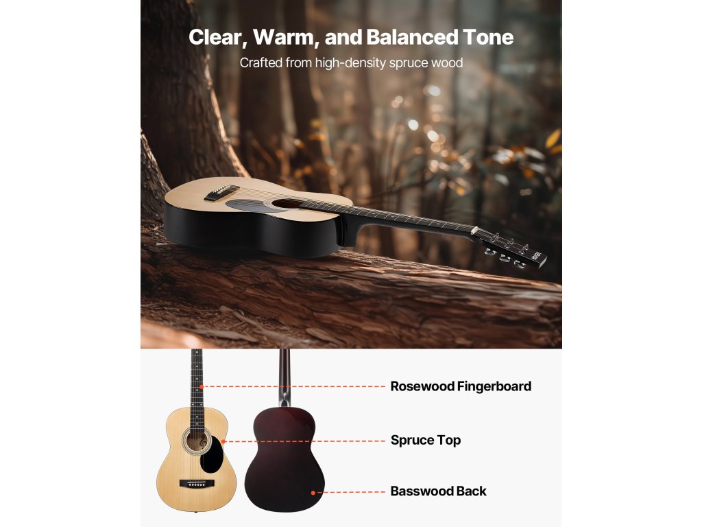 A lucfenyő tetővel és mahagóni testtel ellátott akusztikus gitárunk meleg, telt hangzást biztosít, amely bármilyen stílushoz illik. A legtöbb felnőttnek megfelelő méretű. Gyorsan hangolható, vízálló, tartós oxfordi gigatáskával és az összes lényeges tartozékkal.