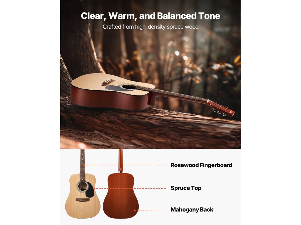 A lucfenyő tetővel és mahagóni testtel ellátott akusztikus gitárunk meleg, telt hangzást biztosít, amely bármilyen stílushoz illik. Mérete alkalmas idősebb, némi tapasztalattal rendelkező játékosok számára. Gyorsan hangolható, vízálló, tartós oxfordi gigatáskával és minden lényeges tartozékkal érkezik.