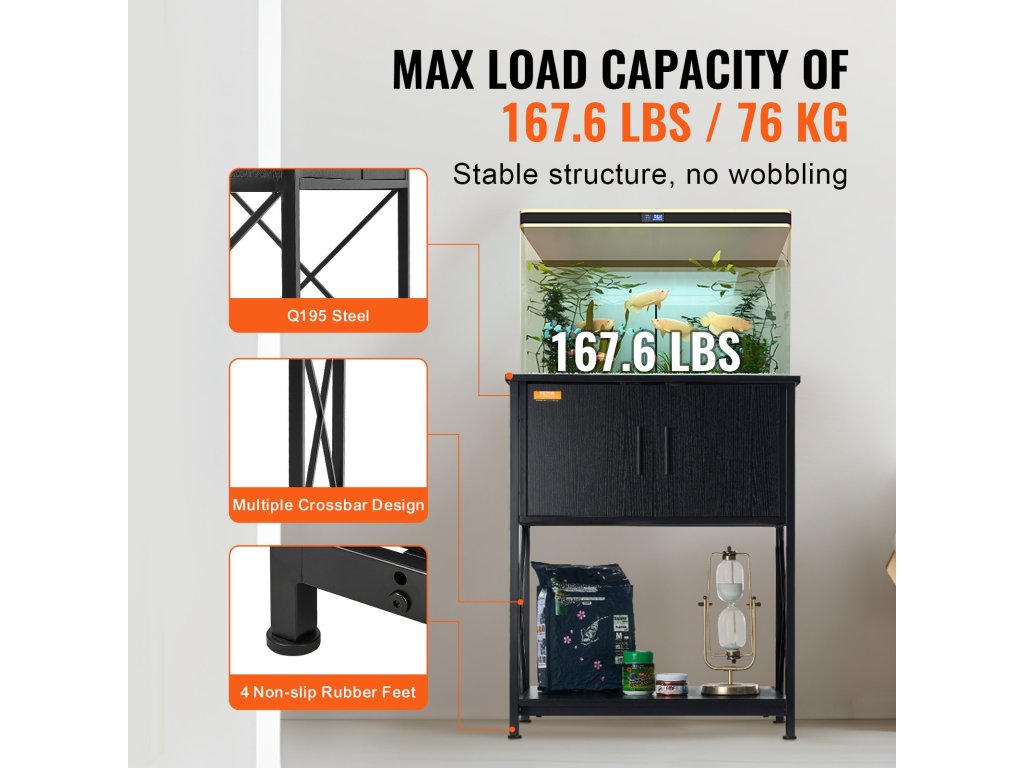 Háztartási akváriumállványunk akár egy 20 gallonos akváriumot is elbír. Az állvány Q195 acélvázból készült, és akár 76 fontot is elbír. A háromszintes konstrukció több tárolási szinttel és beépített fiókkal bőséges tárolóhelyet biztosít az Ön kényelme érdekében.