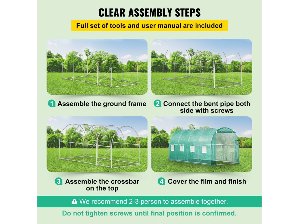 A karos üvegház készletünk telepítése problémamentes a világos és könnyen olvasható használati útmutatónak köszönhetően. Csak találja meg a megfelelő alkatrészeket és kombinálja őket, majd a telepítés folyamata befejeződik.
