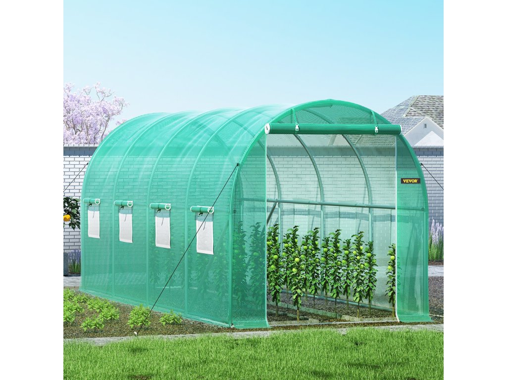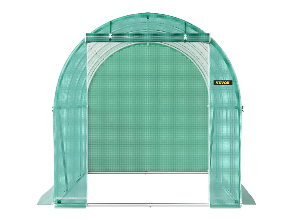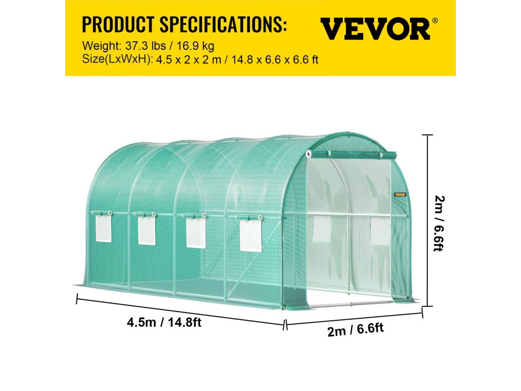 Méretek: 4,5 x 2 x 2 m/14,8 x 6,6 x 6,6 m. Alagutas üvegházunk nagy tárolóterülettel rendelkezik, egy ajtóval és 8 hálós ablakkal, amelyek növelik a légáramlást, hogy segítsék a növények virágzását.