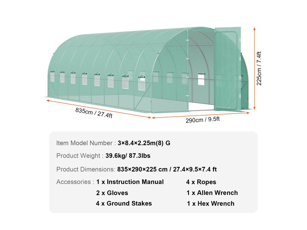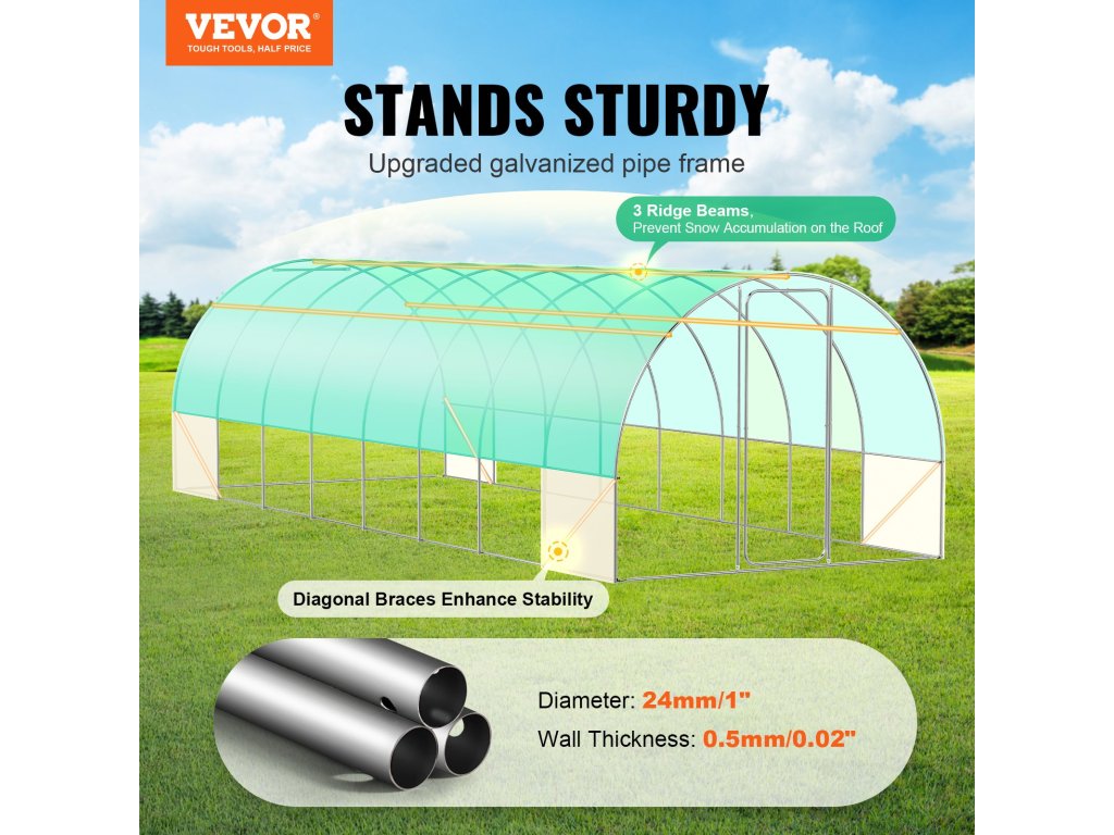 A továbbfejlesztett 24 mm/0,94" vastagságú, 0,5 mm/0,02" falvastagságú, megerősített acélcsövek U alakú kerekekkel és műanyag kampókkal kombinálva stabilabb üvegházszerkezetet biztosítanak. A magas alagút üvegház könnyedén ellenáll a kedvezőtlen időjárási körülményeknek, kiküszöbölve a vetemedéssel és az összeomlással kapcsolatos aggodalmakat.