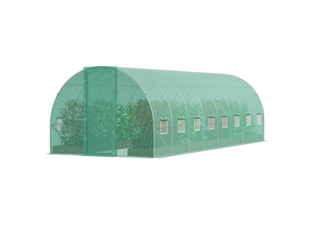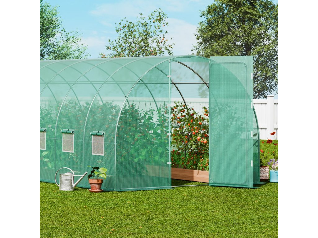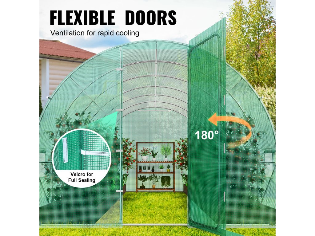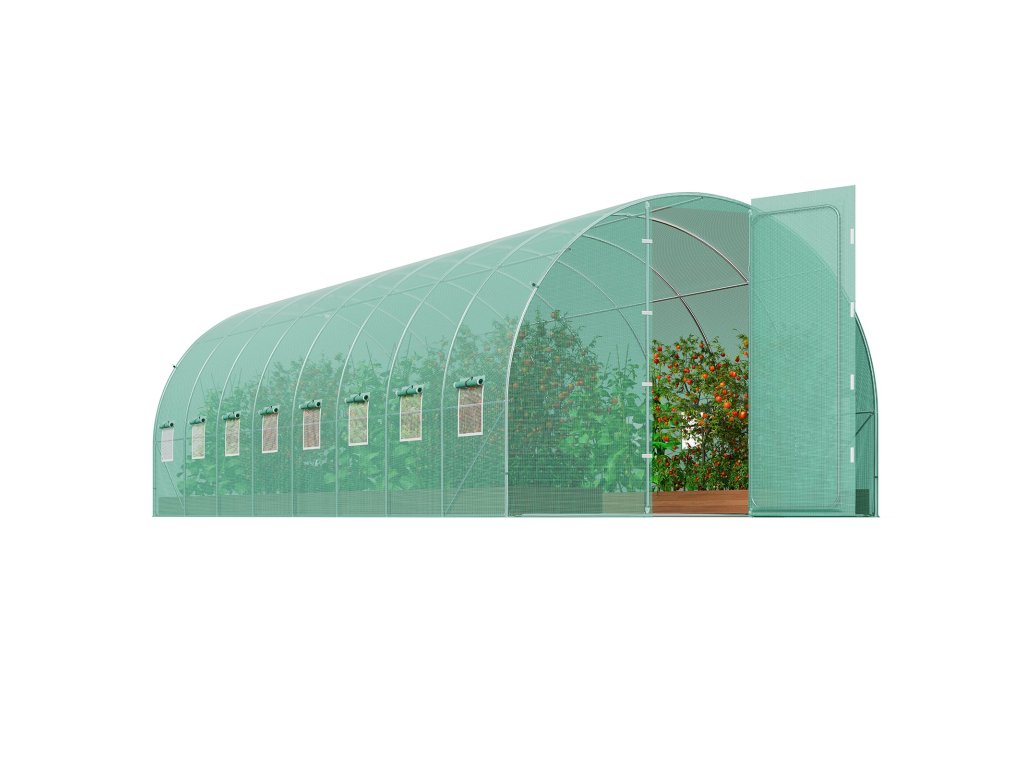 Az alagutas üvegházunk 16 ablakkal és ajtóval van felszerelve a jobb légáramlás érdekében. Hálókkal van felszerelve a kis állatok elleni védelem és a betegségek előfordulásának csökkentése érdekében, az ajtózárak megakadályozzák a véletlen nyitást. Az ablakokon található tépőzáras rögzítők lehetővé teszik a könnyű beállítást, biztosítva a szellőzést és védve a növények egészségét.