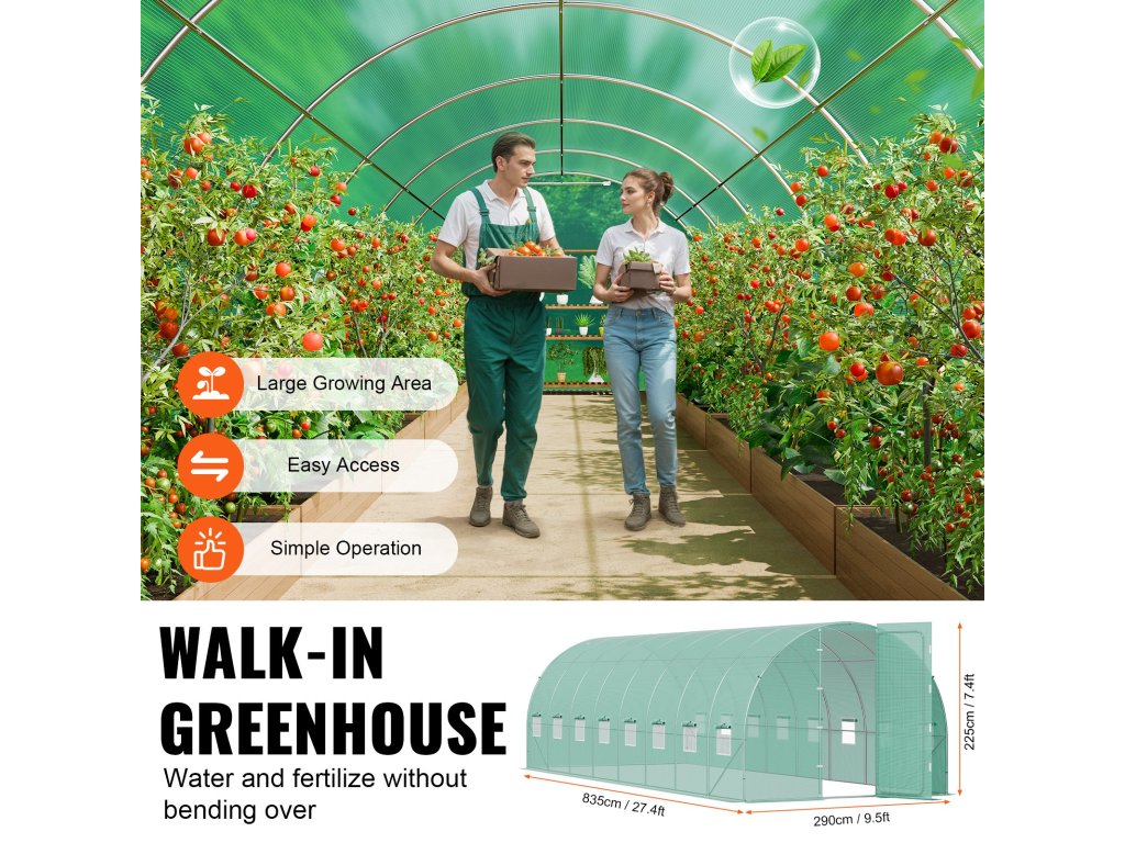 Ennek a karos üvegháznak a nagyméretű mérete lehetővé teszi a különböző növények szabad termesztését és több polc könnyű elhelyezését. Akár otthoni kertészkedéshez, akár egy kis gazdaságban, minden növénytermesztési igényt kielégít.