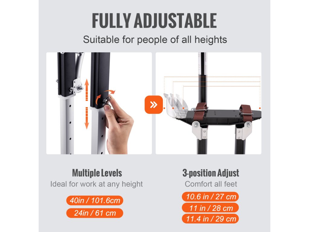 Výšku týchto maliarskych chodúľ je možné jednoducho nastaviť. Rozsah je 24 až 40 palcov. Nastavenie výšky je jednoduché a rýchle. Táto funkcia spĺňa rôzne pracovné potreby! Trojpolohový držiak päty sa prispôsobí veľkosti chodidla od 10,6 do 11,4 palca, takže sú pohodlné pre väčšinu používateľov. Či už vešate sadrokartónové dosky alebo maľujete, tieto chodúle sa dajú nastaviť. Ľahká konštrukcia uľahčuje nastavenie. Tieto maliarske chôdze ponúkajú všestrannosť na rôzne úlohy. Sú ideálne na domáce dekorácie a elektroinštalačné práce. Vďaka možnosti nastavenia výšky sú vhodné na viacero použití.