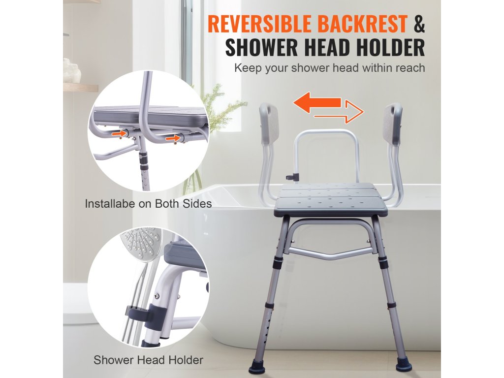 Nincs szükség további szerszámokra! Állítsa fel gyorsan és könnyedén az idősek fürdőszobai székeit. A mellékelt zuhanyfejtartónak köszönhetően a zuhanyfej kényelmesen elérhető közelségben lesz. Ráadásul a háttámla megfordítható, így bármelyik oldalra felszerelheti, hogy megfeleljen a zuhanyzó beállításának.