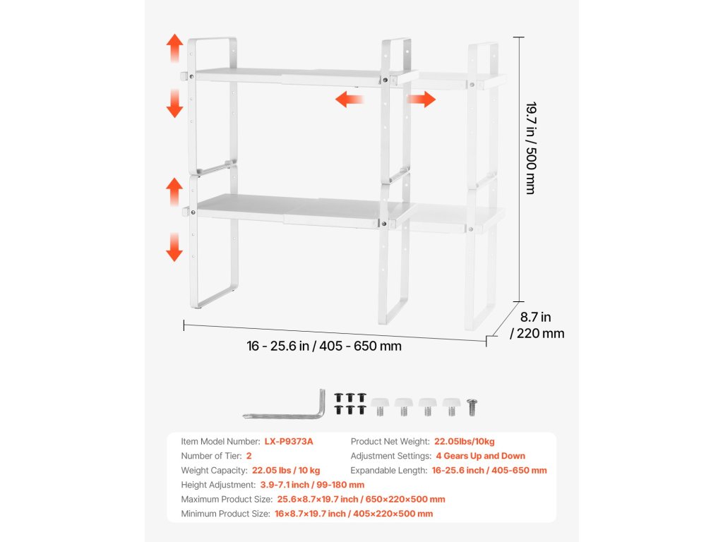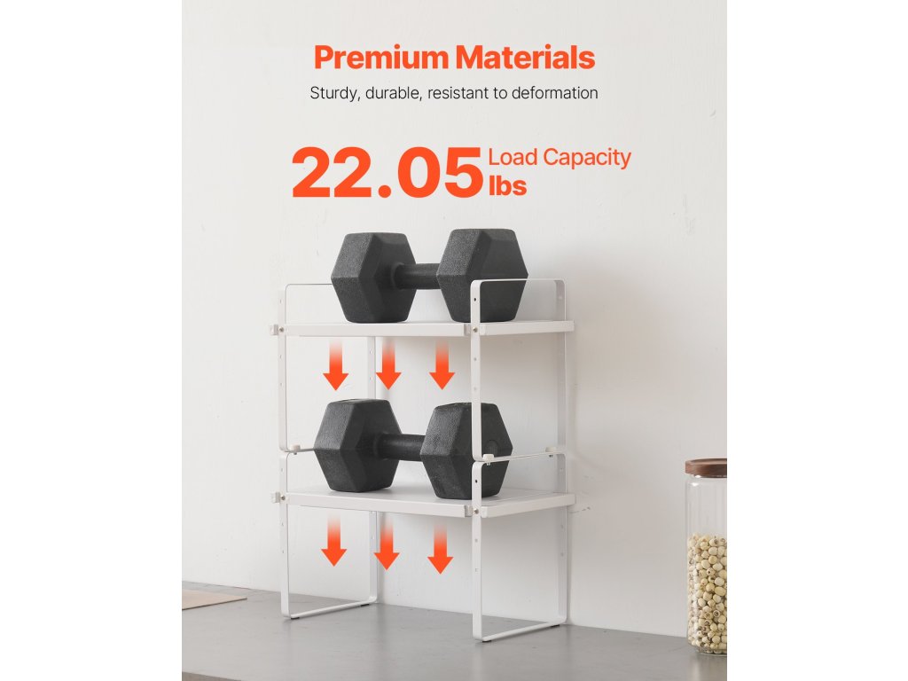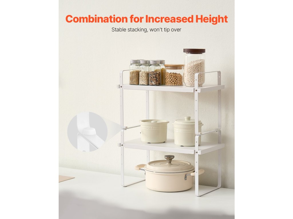 Ez a szekrényrendező állvány támogatja a szélesség és a magasság állítását, és rugalmasan egymásra helyezhető. Önmagában vagy több rétegben egymásra helyezve is használható. Ez a kialakítás nagymértékben növeli a tárolóhelyet, miközben konyhája rendezett és szervezett marad.