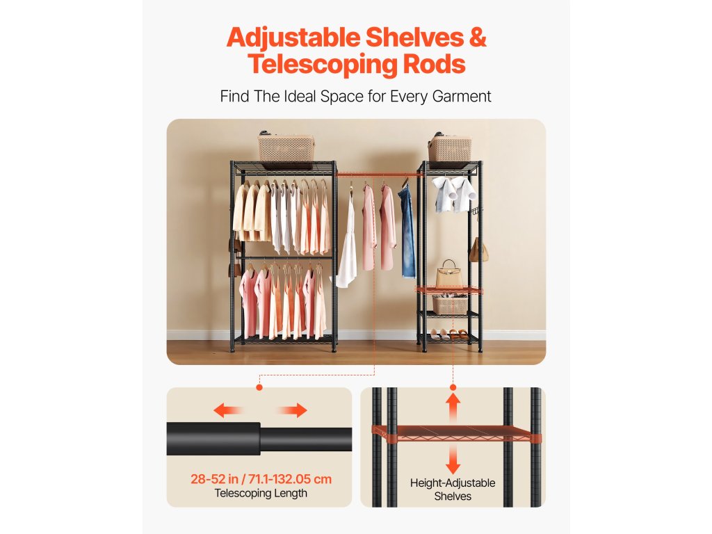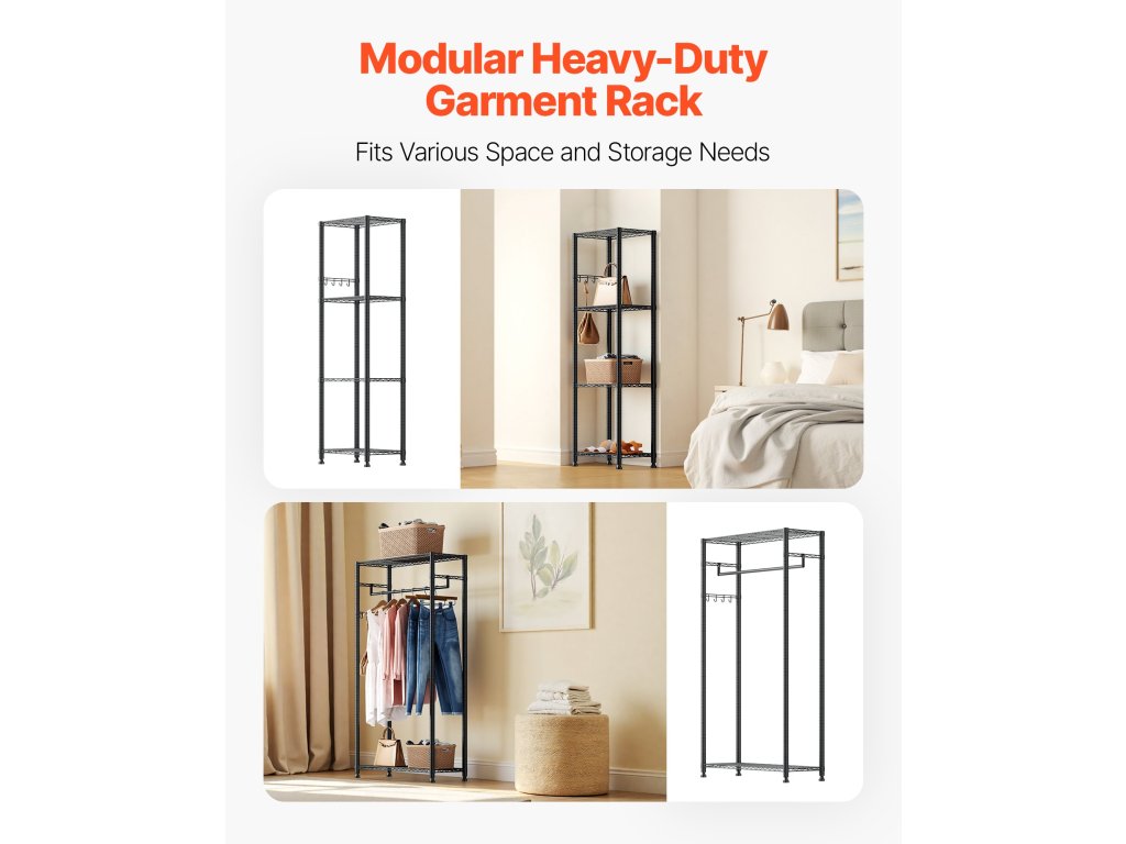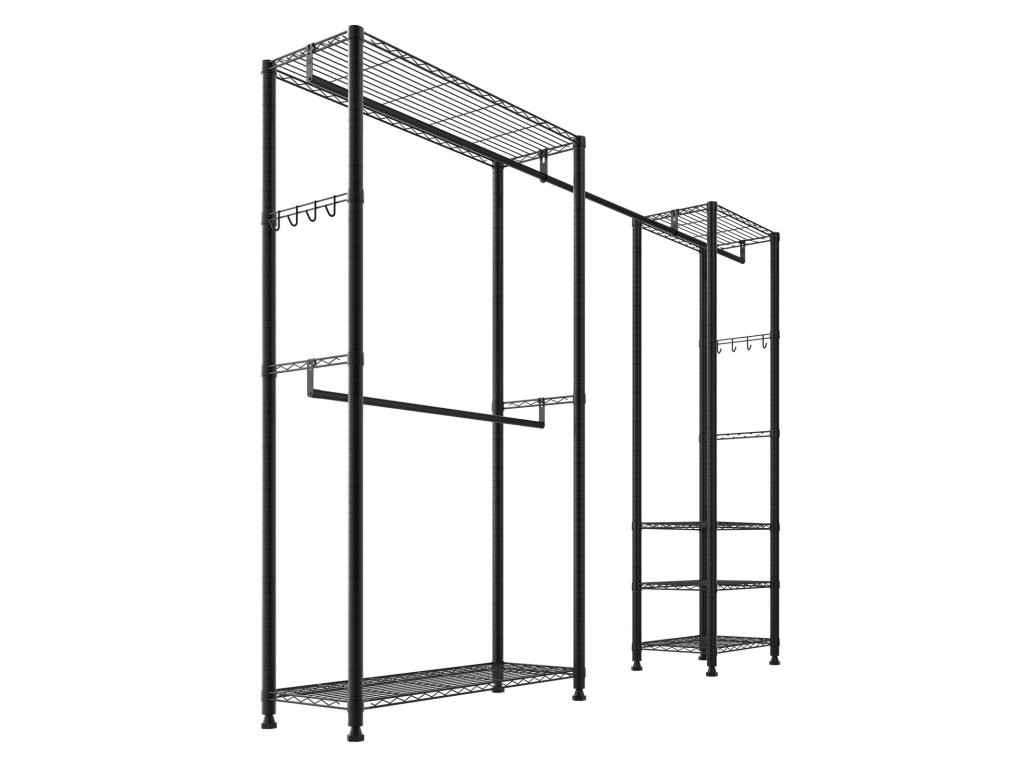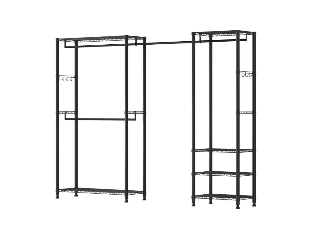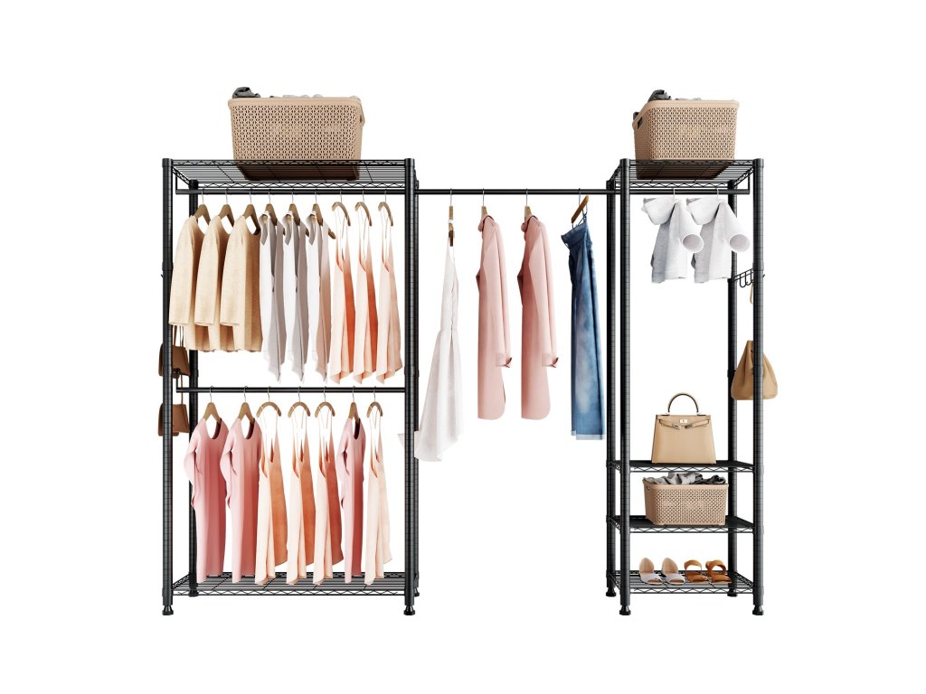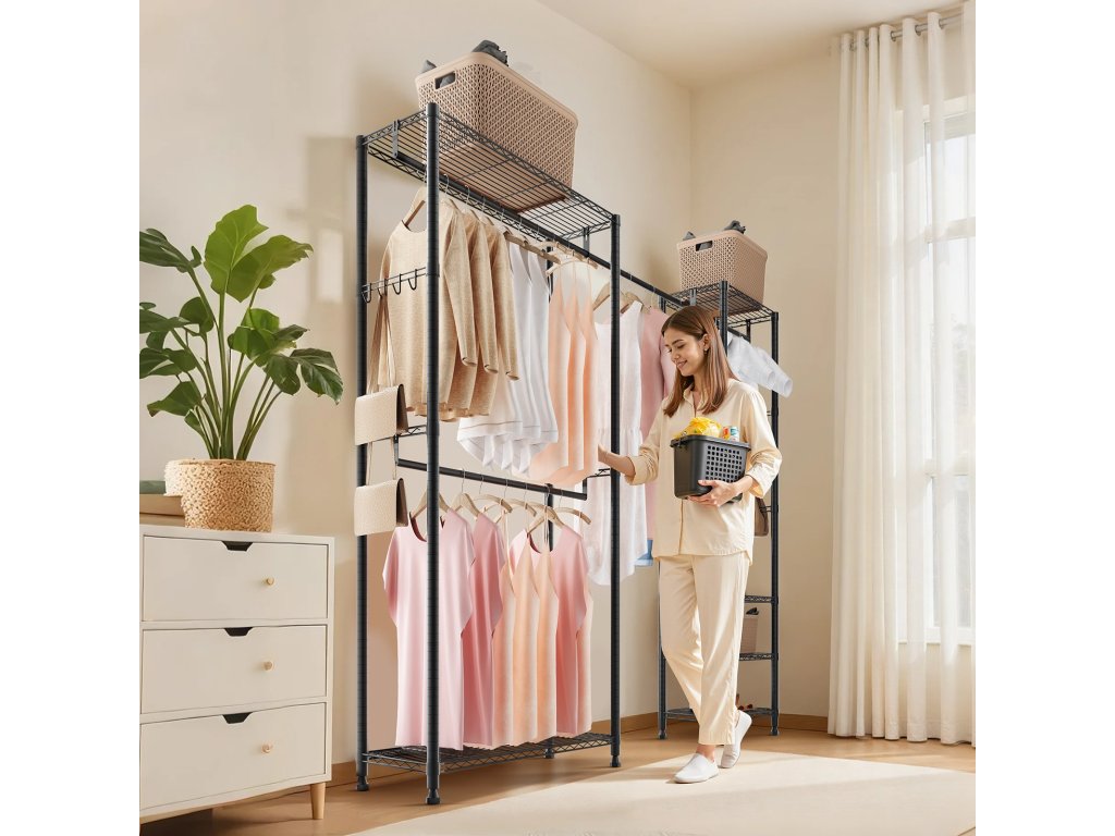 Ez a ruhatartó állvány bőséges tárolóhelyet biztosít, és tartós szénacélból készült a hosszú élettartam érdekében. Mind a polcok, mind az akasztórudak állíthatóak, így a különböző méretű ruhadarabok egyéni tárolása könnyen megoldható. A gyors, szerszámmentes összeszerelés kényelmes és hatékony felállítást biztosít.