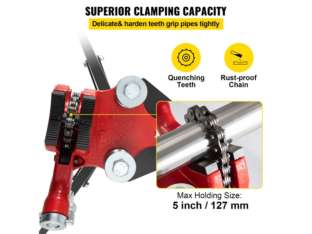 Az edzett fogak és a tömör lánc egyedi kialakításúak a jobb fogás érdekében. Csőszorító átmérő: 1/8-5 hüvelyk (3,2 mm-127 mm).