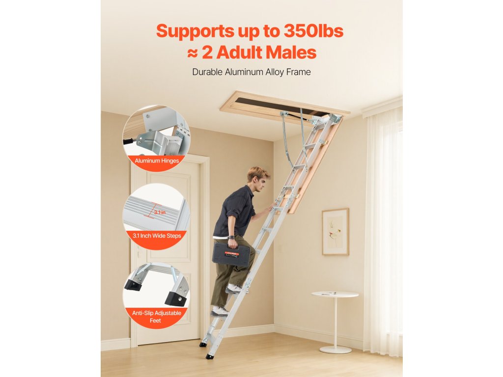 Állítható támasztólábakkal a padló védelme érdekében, 54 x 22,5 hüvelykes nyílásmérettel és 2 magassági opcióval (9,8-10,3 láb / 7,66-9,8 láb), ez a létra sokféle térbe illeszkedik. Telepítéséhez mindössze 3 lépés szükséges, és a részletes használati utasítást mellékeljük.