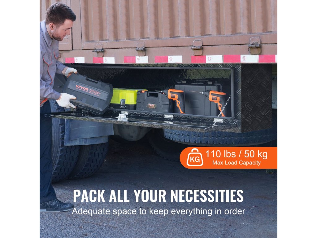 Rendezettek és könnyen hozzáférhetőek a holmijai? A VEVOR alváz alatti szerszámos szekrény bővíti teherautója, pótkocsija vagy más nagyméretű járműve tárolóhelyét. A karbantartási szerszámoktól a kempingfelszerelésig minden szükséges dolgot tárolhat ebben a teherautó dobozban, és mindent rendben tarthat.
