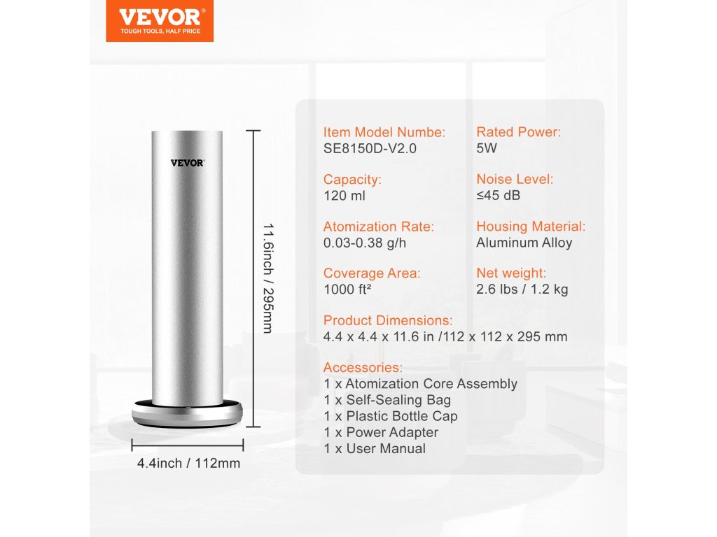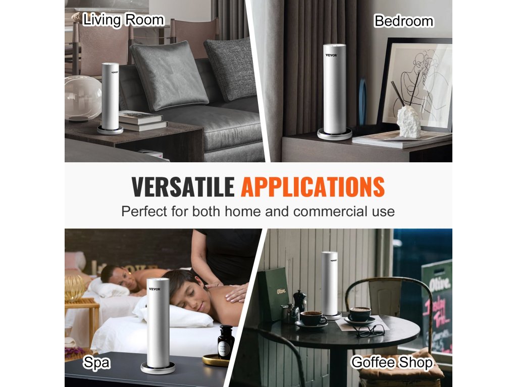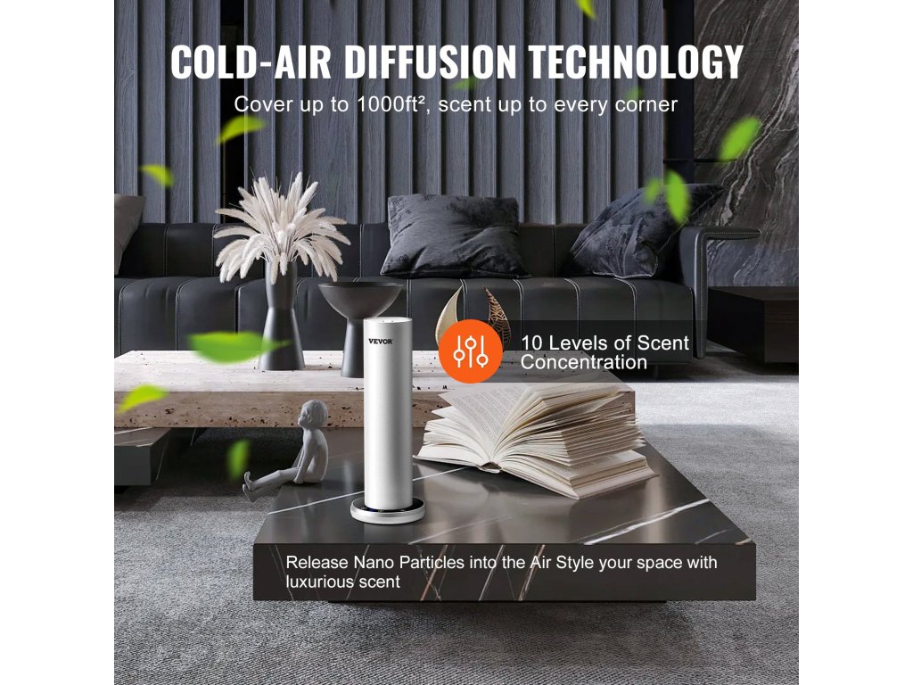 Dobja fel terét a VEVOR illatosított légkeverővel az otthonába! A továbbfejlesztett, erőteljes pumpával, nagy 120 ml-es kapacitással, kényelmes Bluetooth-kapcsolattal és csendes működéssel rendelkező hideglevegő-diffúzorunk tökéletes kiegészítője otthonának vagy irodájának, amely stílusos és kiváló minőségű illatélményt nyújt, amely tartósan tart.