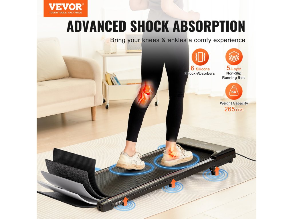 A 6 szilikon lengéscsillapítóval és 5 rétegű csúszásgátlóval ellátott futószőnyeg minimális hatást gyakorol a térdekre és a bokákra, valamint sima és támogató lépést biztosít.