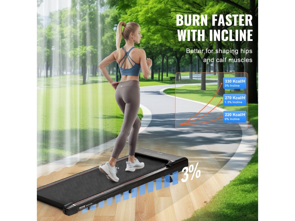 Ez az íróasztal alatti futópad növeli a kalóriafelhasználást, és hatékonyan edzi a csípő- és vádliizmokat az akár 3%-os emelkedési lehetőségnek köszönhetően. Óránként akár 330 kcal kalóriaégetést is elér, így ideális a hatékony otthoni edzésekhez.