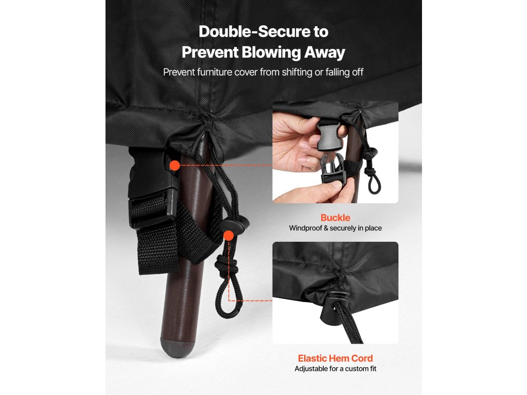 A négy csattal és két húzózsinórral ellátott teraszos étkezőgarnitúra huzat gyors és egyszerű felszerelést biztosít, miközben biztonságos rögzítést és megbízható szélvédelmet nyújt, azonnali és tartós védelmet nyújtva kültéri bútorainak.
