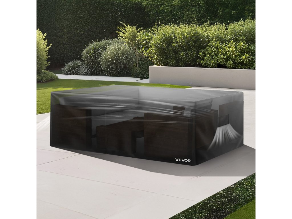 A teraszbútor-borítás univerzális méretű, és megbízható védelmet nyújt a különböző formájú és méretű kültéri bútorok számára. Megakadályozza az időjárás okozta károkat, kiváló állapotban tartja a kültéri asztalokat és székeket, és meghosszabbítja azok élettartamát.