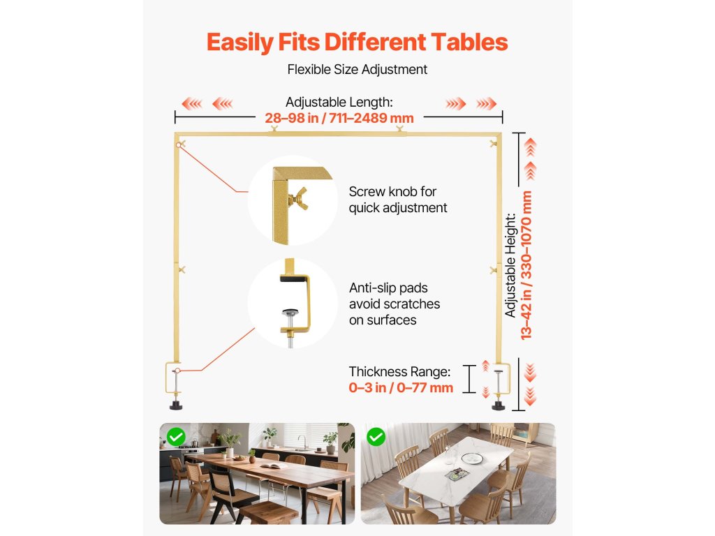 Nincs szükség szerszámokra - egyszerűen rögzítse a C-horgonyt az asztalra, rögzítse a rudakat, állítsa be őket a kívánt magasságra és szélességre, és adjon hozzá díszítéseket. A telepítés gyors és egyszerű bármilyen méretű asztalhoz.