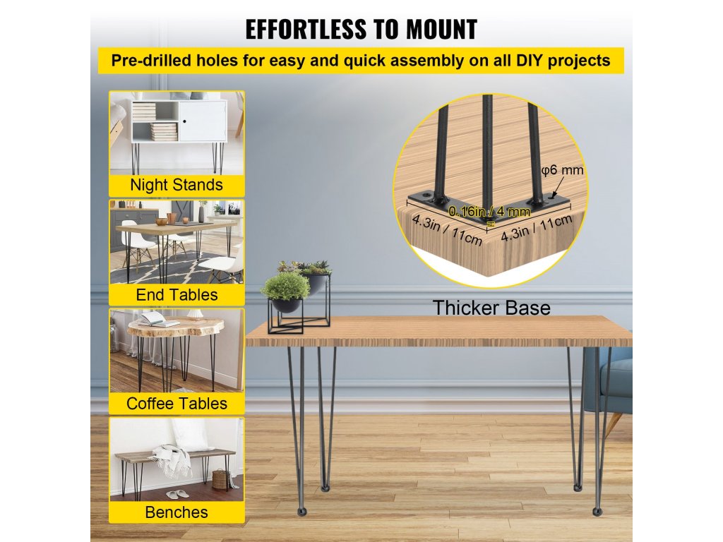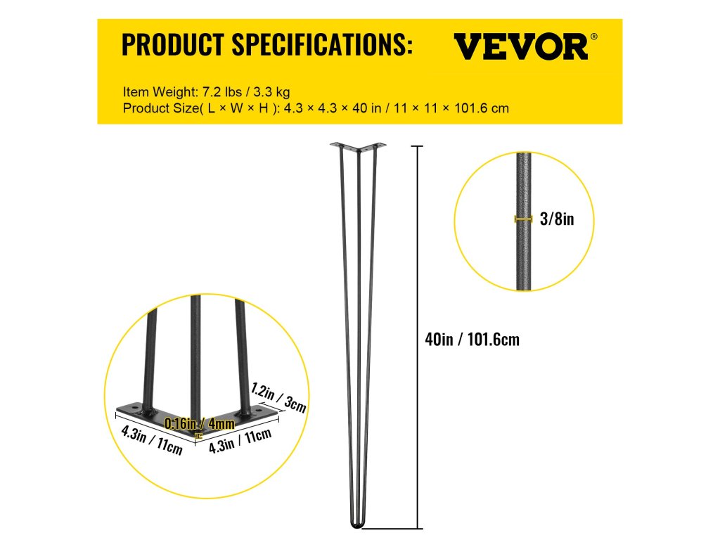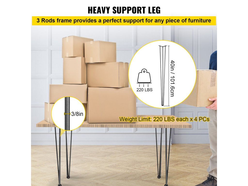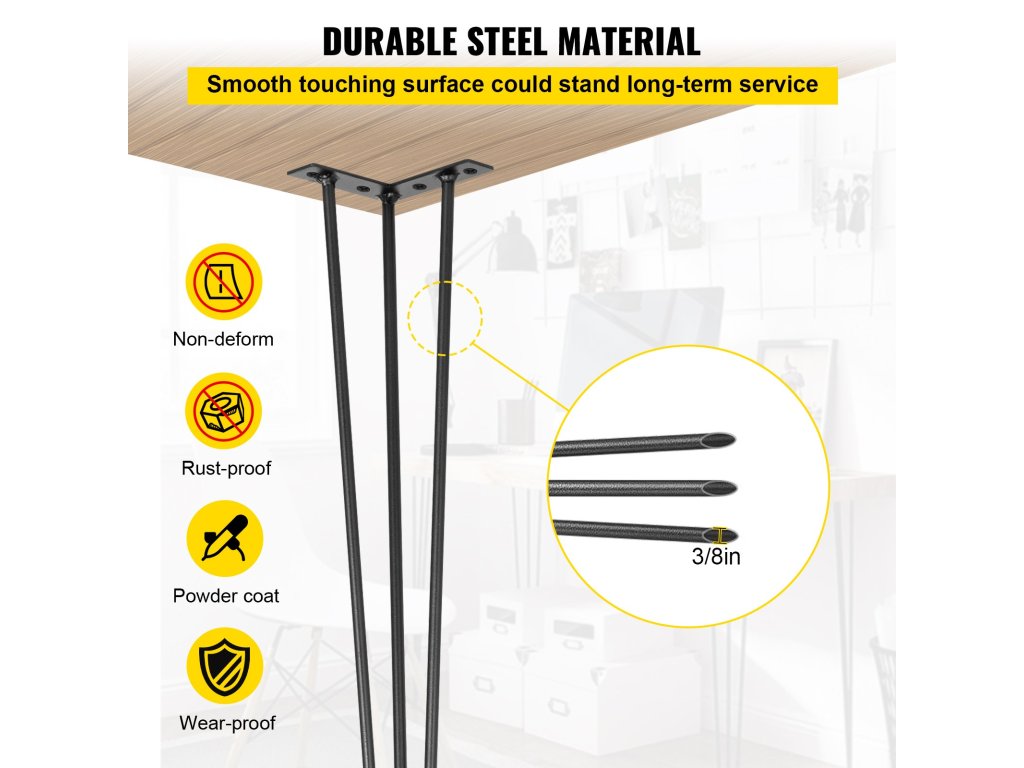 Fekete hajtűs asztallábaink 3/8" megerősített 100% tömör acélból készülnek. Minden láb súlya 220 font, 4 készlet max. 880 fontot támogat.