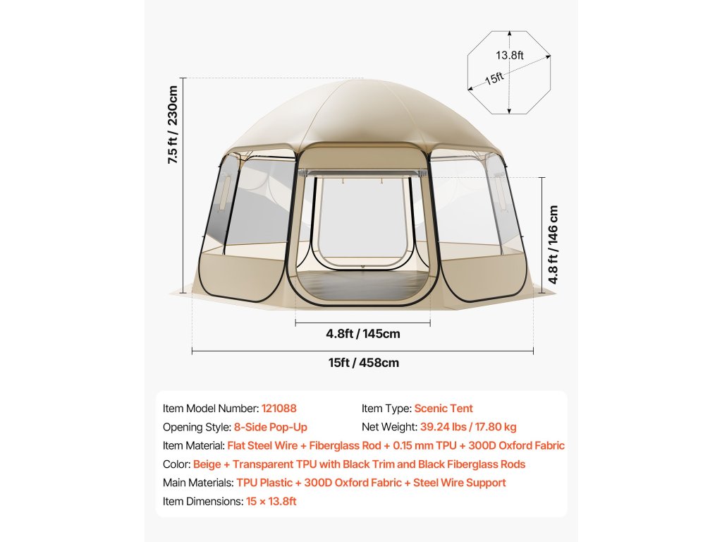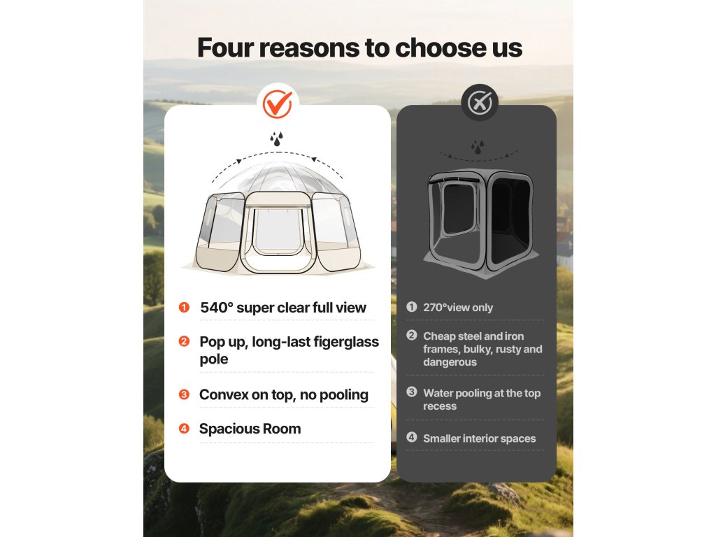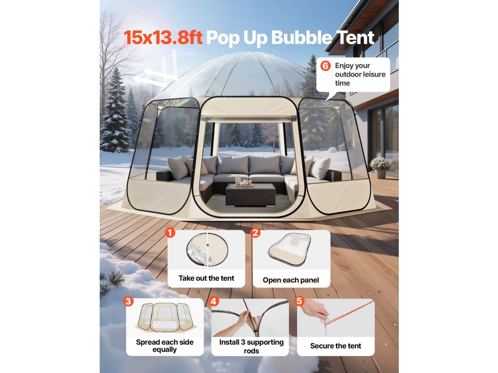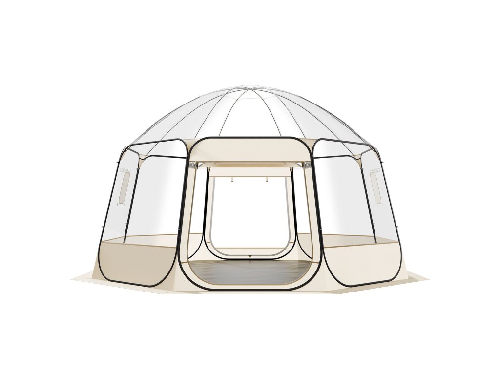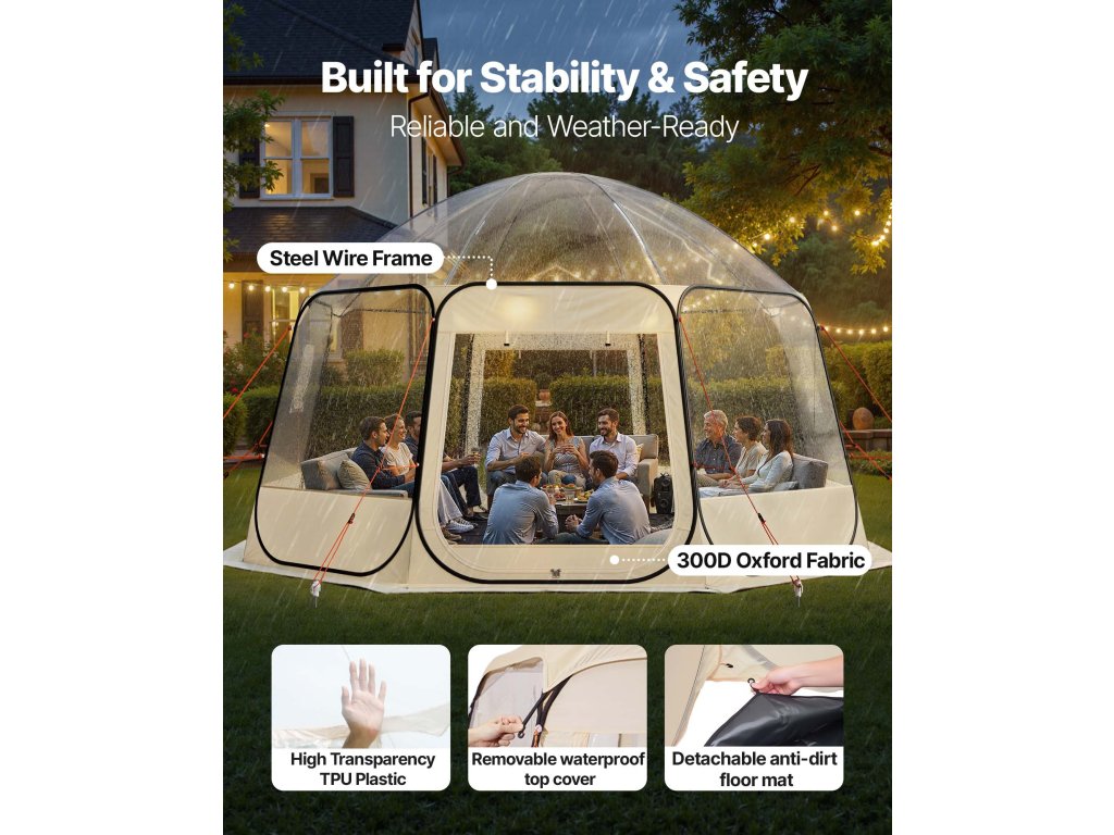 Ez a 12-15 fős pop-up buborékos sátor TPU és 210D Oxford szövetből készült, acélhuzallal a stabilitás és tartósság érdekében. A pop-up kialakításnak köszönhetően másodpercek alatt gyorsan felállítható, így ideális kültéri vagy hátsó udvari használatra. A több felhúzható oldalablak lehetővé teszi a könnyű légáramlás-szabályozást és a magánszféra védelmét.