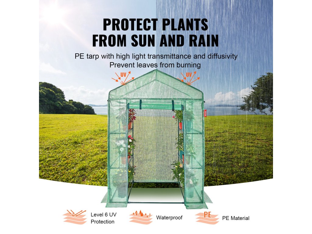 Je ideálny na zakladanie sadeníc. Dobre sa hodí aj na pestovanie byliniek a malých rastlín. Konštrukcia je ideálna na mestské záhradkárčenie. Dobre sa zmestí do malých priestorov a na balkóny. Vďaka svojej konštrukcii je vhodný na rôzne obdobia výsadby. Okrem toho skleník umožňuje jednoduchý prístup a starostlivosť. To je výhodné pri monitorovaní rastu rastlín. Náš skleník je užitočný aj na ochranu rastlín pred škodcami, pretože ich chráni pred hmyzom a živočíchmi; univerzálny dizajn zaručuje, že spĺňa rôzne záhradnícke potreby. Nastavenie a používanie je jednoduchý proces, vďaka čomu je tento skleník praktickou voľbou pre záhradkárov všetkých úrovní. Skleník VEVOR ponúka spoľahlivé riešenie pre mnohé pestovateľské potreby, aby vaše rastliny zostali zdravé a dobre sa im darilo v akomkoľvek prostredí.