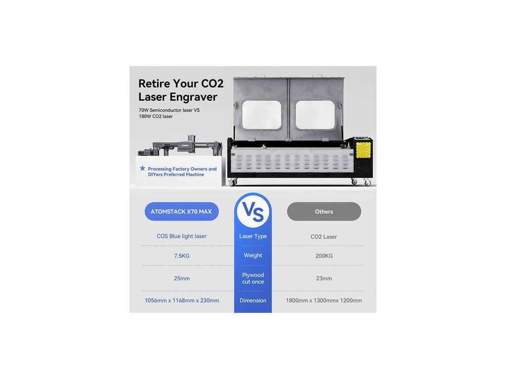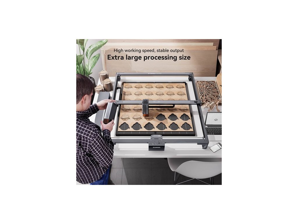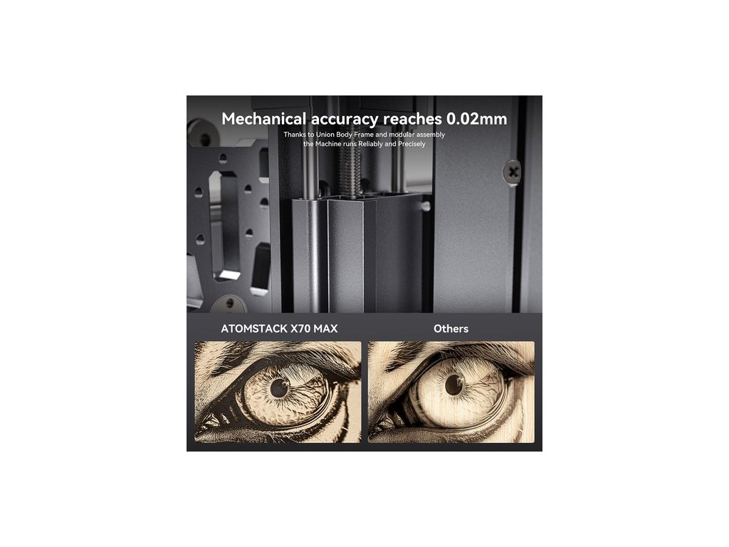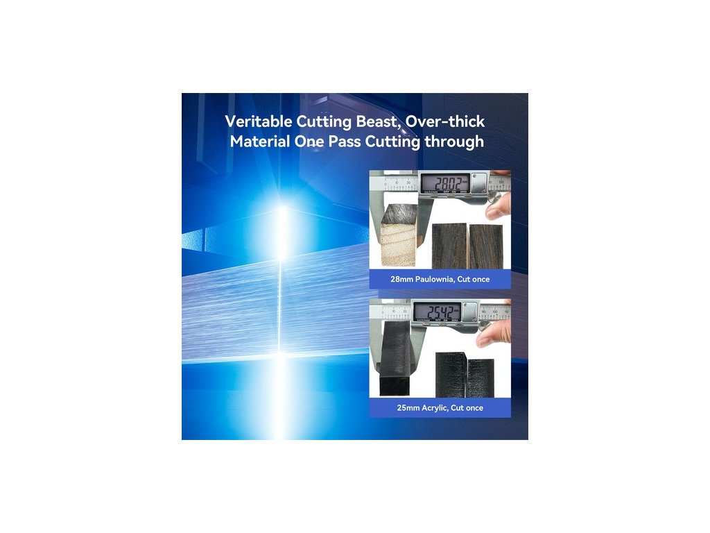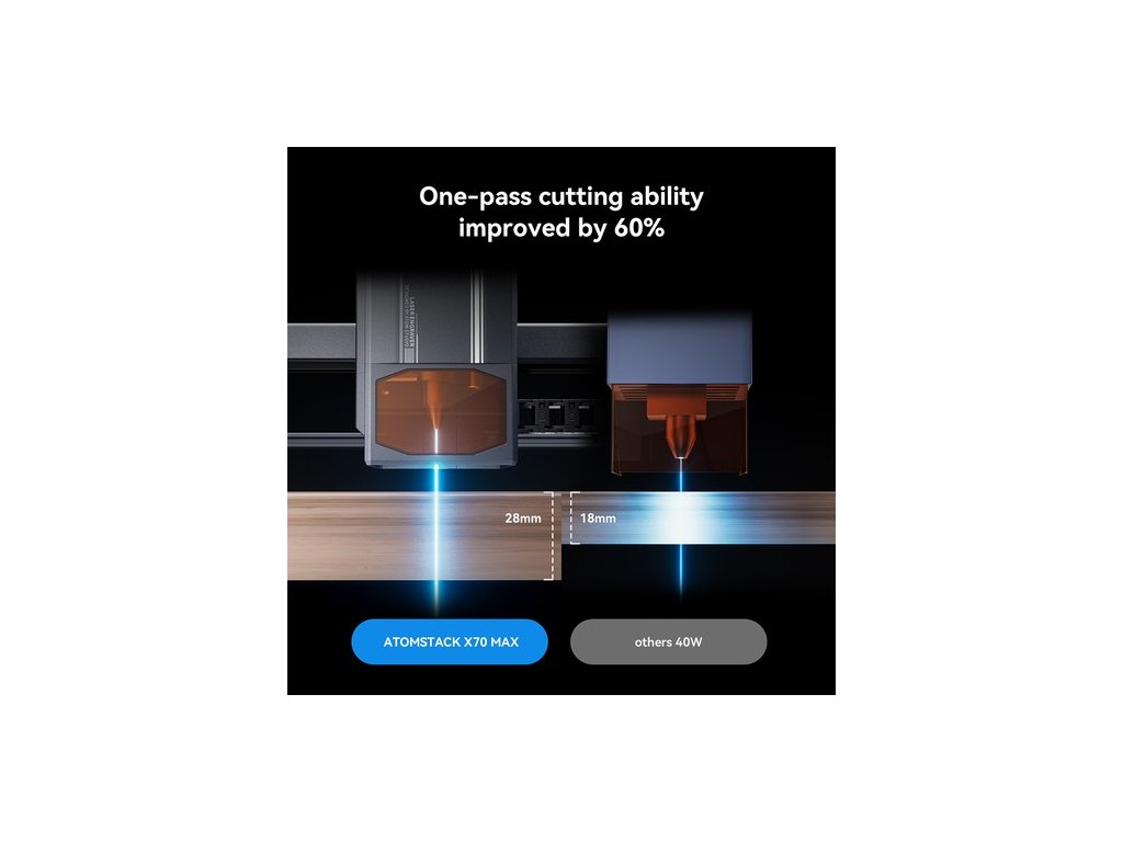 Az AtomStack X70 Max kivételes vágási teljesítményt nyújt, amely 25 mm fekete akril, 12 mm MDF sűrűségű lap, 30 mm fenyőfa és 0,3 mm rozsdamentes acéllemez pontos vágására képes.