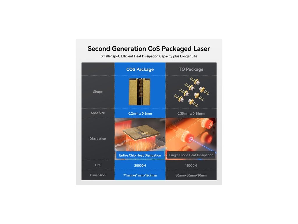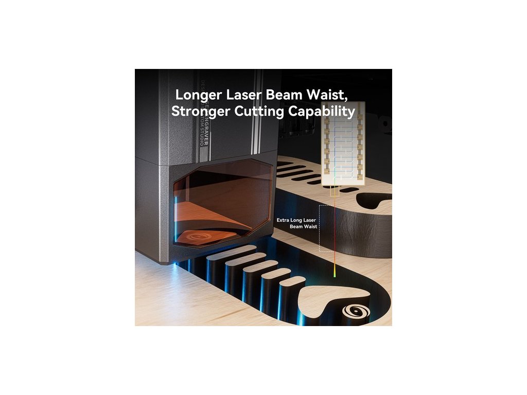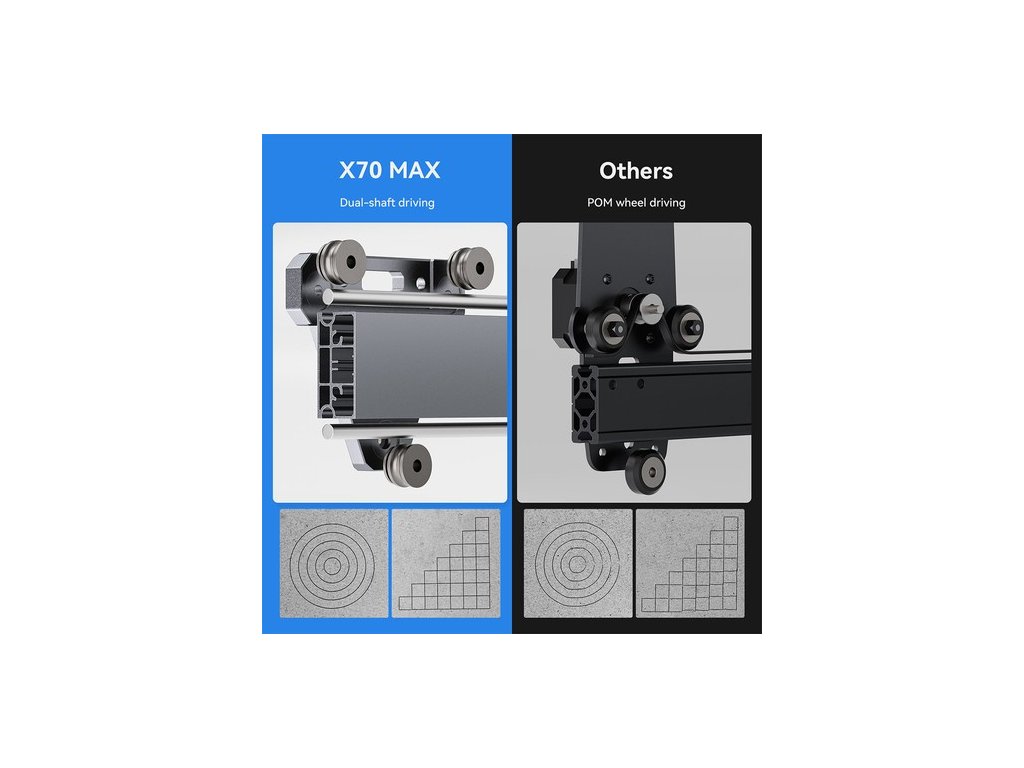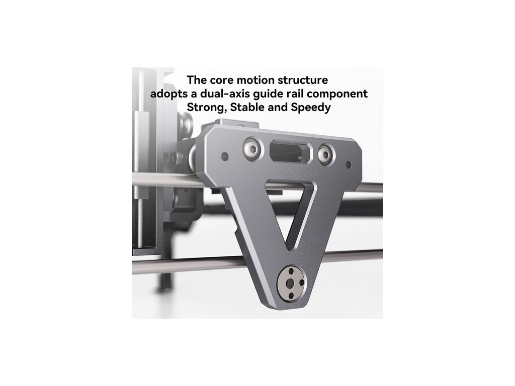 Az alacsony súlypontú kéttengelyes sínrendszerrel felszerelt háromtengelyes mechanizmus nagy sebességű stabilitást (akár 400 mm/s) és csendes működést garantál, így ideális az igényes gravírozási és vágási feladatokhoz.