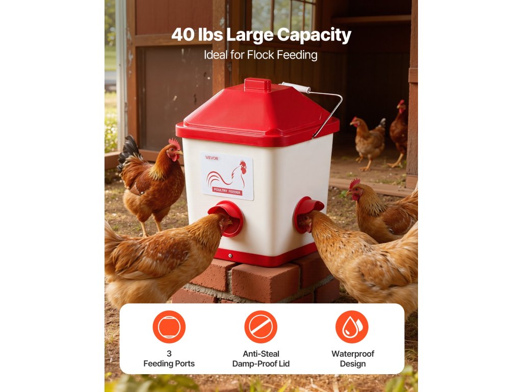 Csirkeetetőnk nedvességálló fedővel ellátott etetőnyílásokkal rendelkezik, amelyek megakadályozzák, hogy a mókusok, madarak, rágcsálók és más állatok ellopják a takarmányt. Segít csökkenteni a takarmányveszteséget a szabadban, és biztosítja, hogy a takarmány biztonságban maradjon.