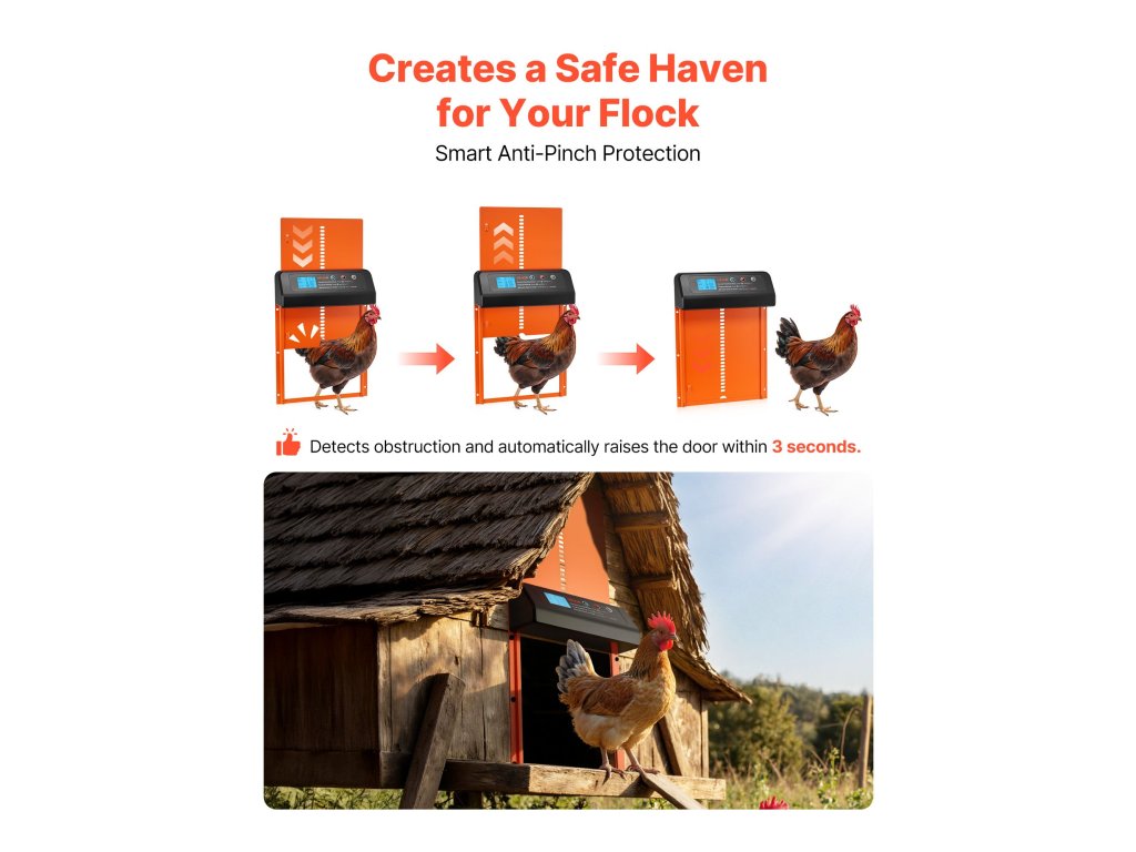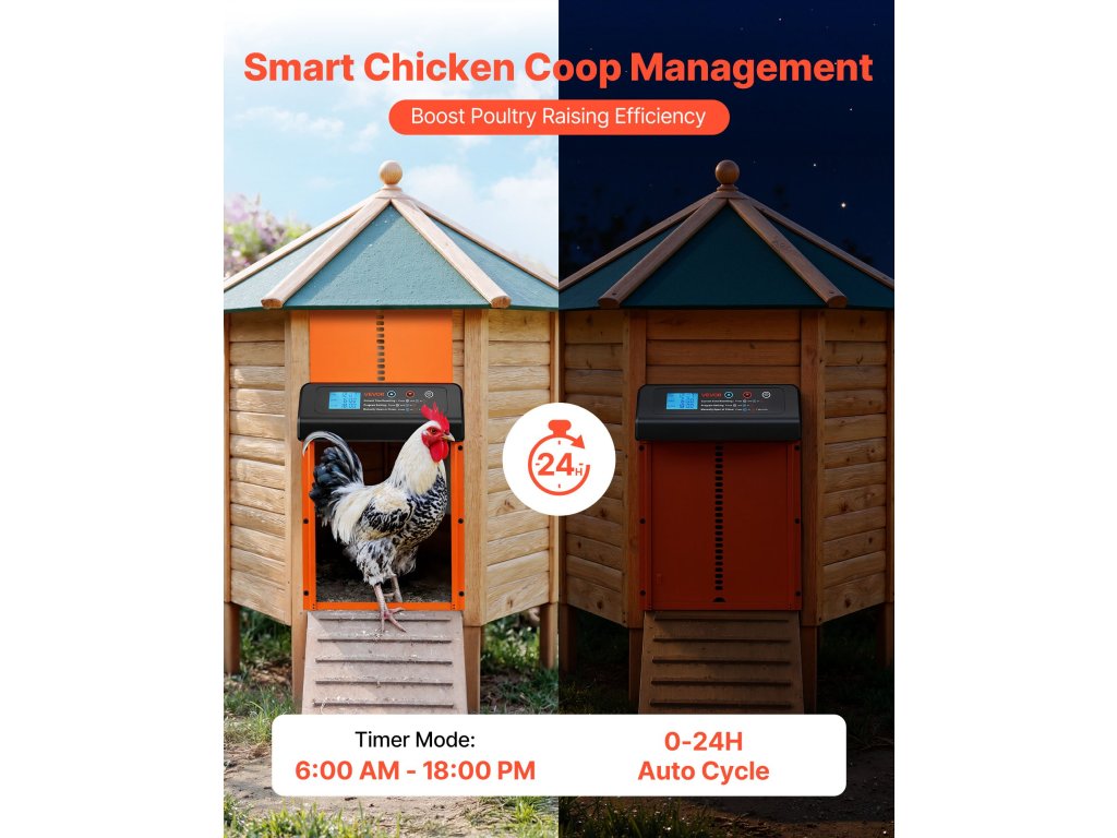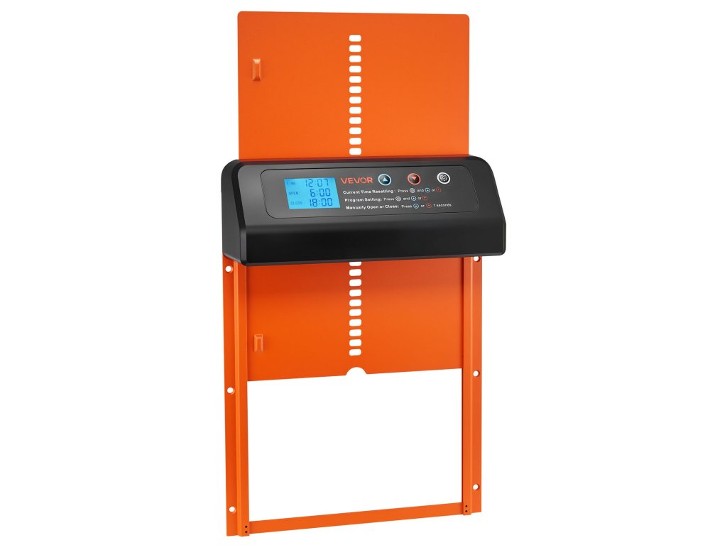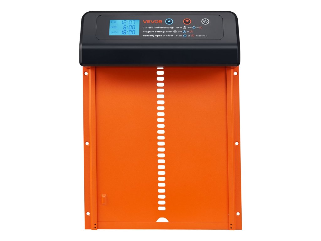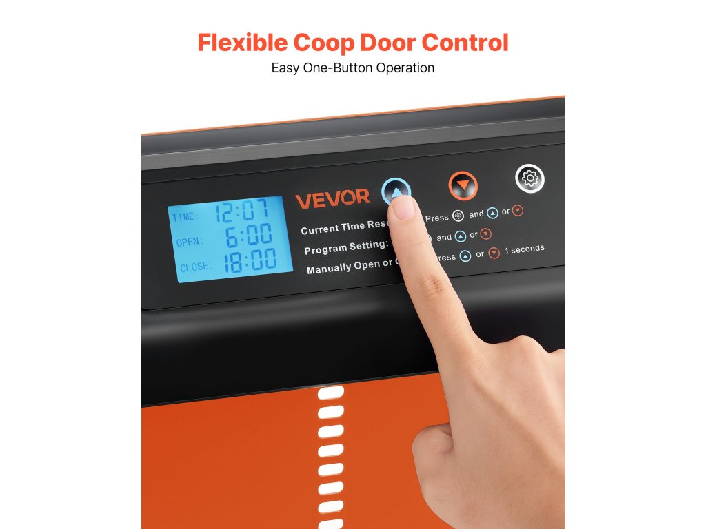 Ez a csirkeajtó nagyméretű kijelzővel van felszerelve, amely világosan mutatja az időt, az ajtó állapotát és a tervezett beállításokat. Az időzítők beállítása, az üzemmódok megváltoztatása vagy az állapot ellenőrzése egyszerű és intuitív.