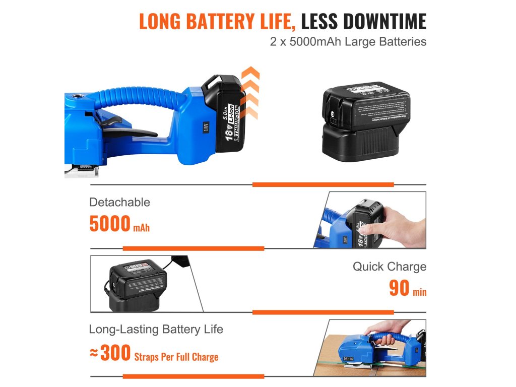 Az erős kefe nélküli motornak köszönhetően ez az elektromos szalagvágó stabil és erőteljes teljesítményt nyújt. A szalagok meghúzása egyetlen gombnyomással gyerekjáték; nincs szükség izmokra. Mindenféle csomagolási munkához kiválóan alkalmas, a papír és alumínium csomagolásától kezdve az acél és fa csomagolásáig.